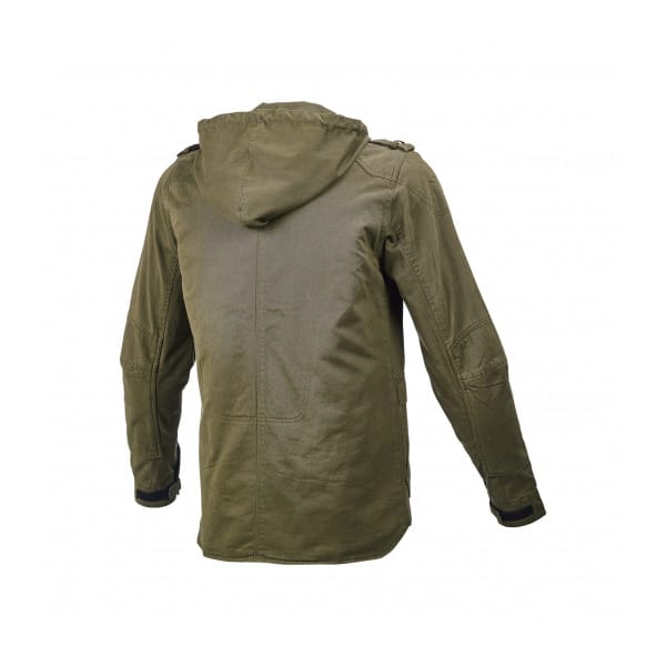 De Combat is een stoffen herenjas die in elke ‘gewone’ kledingzaak een plaats heeft. De hoody – vanzelfsprekend makkelijk te verwijderen – is wat dat betreft uitstekende camouflage. Achteraan kan de capuchon door middel van een knoop vastgemaakt worden op de rugzijde, wat verhindert dat je met een mini-parachute onderweg lijkt als je na een rood stoplicht toch even vlot door de eerste versnellingen van je caféracer borstelt. Andere vermeldenswaardige features zijn de Coat hanger (om het extra gewicht van de motorjas te dragen), de sleutelring vooraan, de Belt Loop en de twee schouderstraps. De mouwuiteinden, met de zeer specifieke ‘cuff straps’, zijn een geslaagde combinatie van functionaliteit en stijl.