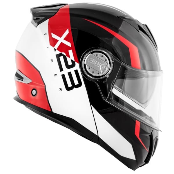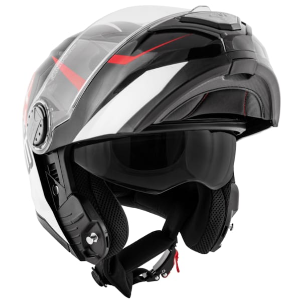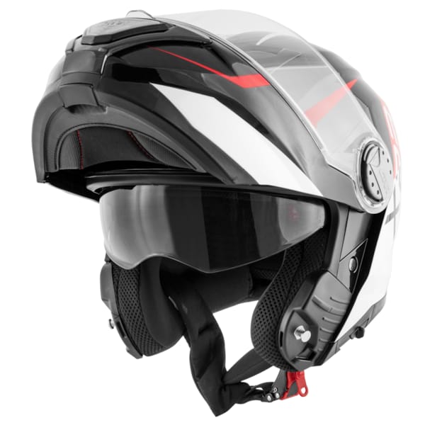 Vooraan in het midden vindt je hand ook met handschoen en zonder veel zoeken het kliksysteem om de helm open te klappen. Dat gaat vlot en helemaal bovenaan klikt alles vast. Moet ook, want de Viper heeft een dubbele homologatie en is dus zowel integraal- als jethelm. En samen is dat een systeemhelm. U bent nog mee, we voelen het.