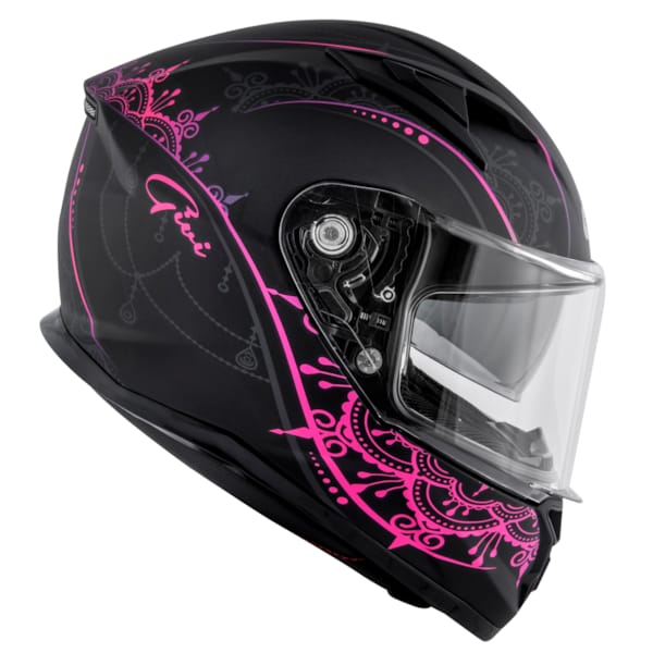 De Stoccarda is standaard voorzien van een transparant en krasbestendig vizier. Het monteren of verwijderen gaat snel en makkelijk, dankzij een quick release systeem. Een intern en getint zonnevizier komt dankzij een eenvoudig mechanisme, te bedienen aan de zijkant van de helm, tevoorschijn wanneer het nodig is en wordt even vlot weer weggeborgen. De plaatsing van een pinlock-lens is voorzien. Deze lens wordt niet meegeleverd, maar is hier te bestellen. Een in lengte aan te passen micrometische sluiting zorgt er voor dat de helm perfect op zijn plaats blijft zitten. De zachte kinriem vergroot het draagcomfort. De nekrand, aangevuld met een extra kinrand, bevordert de geluidsisolatie en vermindert de kans op whiplash en de ongemakken van te veel rijwind. De goed aansluitende voering – makkelijk te verwijderen en wasbaar – van deze helm is op maat gemaakt en hypoallergeen. De Stoccarda is uitgerust met een ademdeflector om damp op het scherm te voorkomen. In de doos wordt geen kit met reflecterende stickers meegeleverd. Het aanbrengen van deze stickers is verplicht in Frankrijk. Reflecterende helmstickers vind je hier.