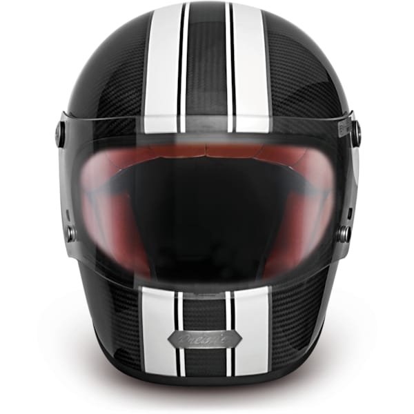 Premier focust zich vooral op vintage helmen, met naast deze overduidelijke retrovariant nog een pak andere uitgesproken tekeningen en designs. Denk aan pin-ups, soldaten, haventattoos en mannen met baarden. Pistons, een racenummer, het geblokte motief van de finishvlag, het is duidelijk dat je hiermee een paar decennia terugkeert in de tijd. Zo hoort het ook natuurlijk, als je effectief die lederen jas aantrekt en de caféracer in eerste versnelling mikt.