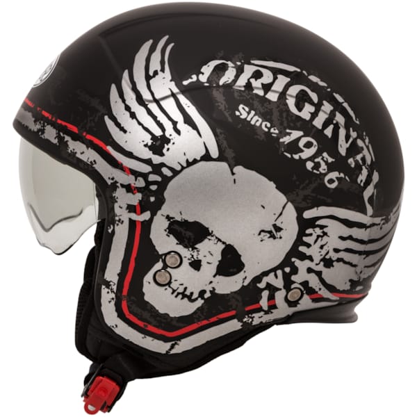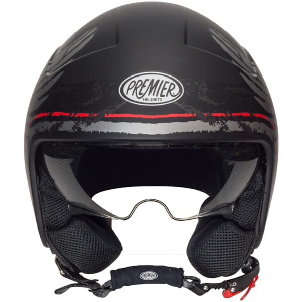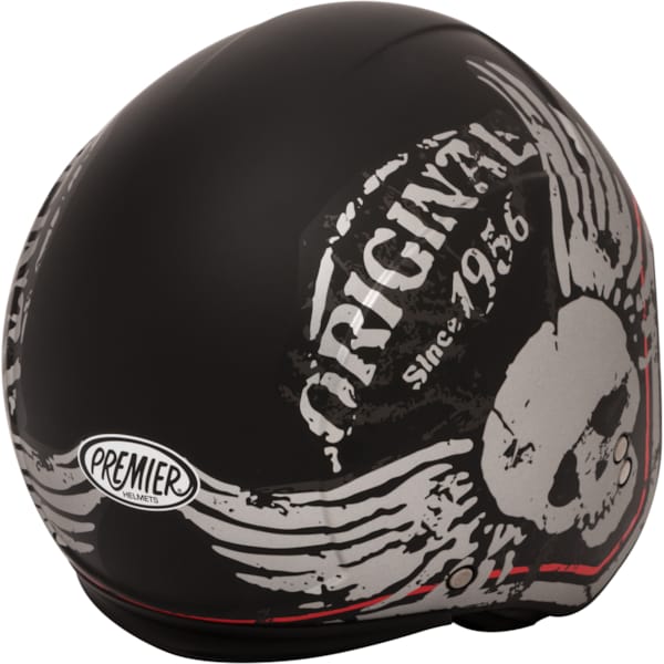 Premier focust zich vooral op vintage helmen met een pak uitgesproken tekeningen en designs. De Rockers zijn wat dat betreft net iets minder opvallend, al blijft het retrogehalte ook hier wel prominent aanwezig. Dit matzwarte exemplaar met typisch finishvlag-motief is hoe dan ook een stijlvolle en knappe keuze.