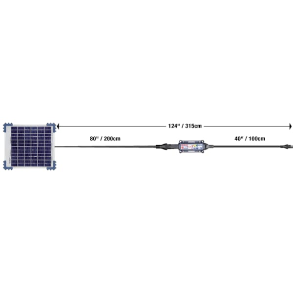 De OptiMate-laadregelaar staat los van het paneel en kan dicht bij het voertuig of de accu worden geplaatst, zodat de laadvoortgang en het onderhoud van de accu eenvoudig kunnen worden opgevolgd. Het zonnepaneel moet zo worden gemonteerd dat het direct zonlicht krijgt. Het bereik/de afstand tussen accu en paneel bedraagt 315 cm / 124 ”. Gebruik de OptiMate-verlengkabels O-03 of O-13 om het zonnepaneel over een langere afstand met de OptiMate-laadregelaar te verbinden.