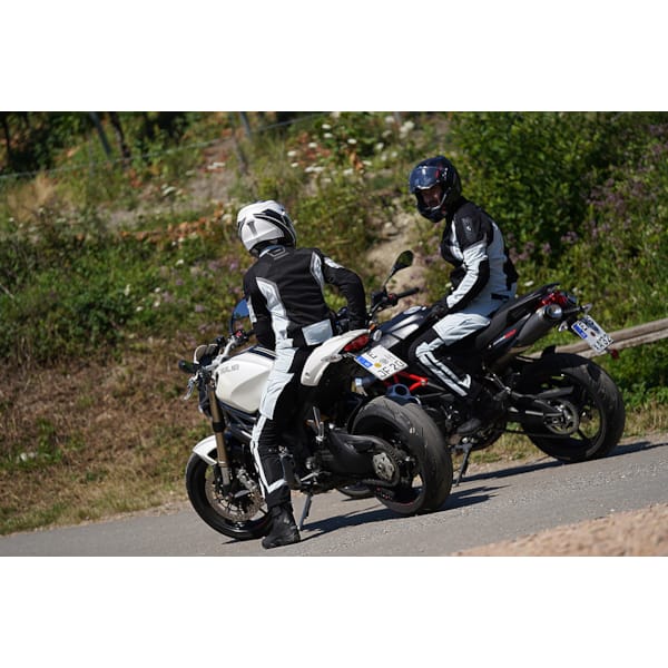 Een doorwaaijas waarin we vervolgens heel erg vlotjes een Humax®-membraan kunnen ritsen. Waterdicht, winddicht en ademend. Hop. En daar gaat de waaier aan mogelijkheden plots helemaal open. Want nu ben je niet beperkt tot die ene dag met fantastisch zomers motorweer. Nu kan je in zowat elke (min of meer ‘gewone’) omstandigheid vertrekken en probleemloos onderweg bijsturen. Nu kan je plots van een stuk in het voorjaar tot een eind in het najaar de motor op. Zolang de temperaturen geen schrikbarende dip kennen, zit het safe. Letterlijk én figuurlijk. Het verwijderbare Humax®-membraan volstaat ruimschoots voor wat de weergoden doorgaans in petto hebben.