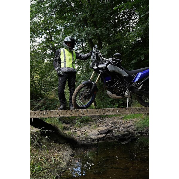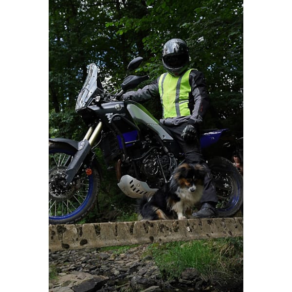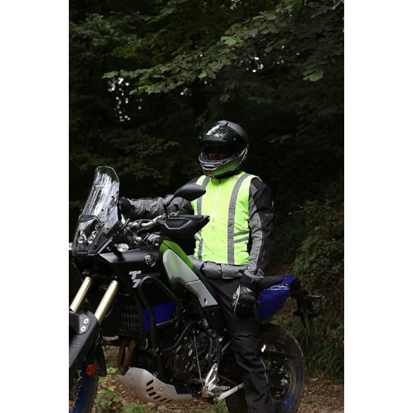 Deze reflecterende overjas – het is geen autonome motorjas – bestaat voor 100% uit polyester en is op borst- en rugzijde ruim voorzien van meshpanelen. Openen en sluiten doe je met een centrale rits, waardoor je dus ook niet hoeft te worstelen om het fluohesje over je helm te trekken. Twee keer een dubbele velcroriem (vier stuks, inderdaad) laten je toe aan de flanken te variëren met breedte en pasvorm. Ook al omdat de zwartgekleurde stukken op de flank elastisch zijn.