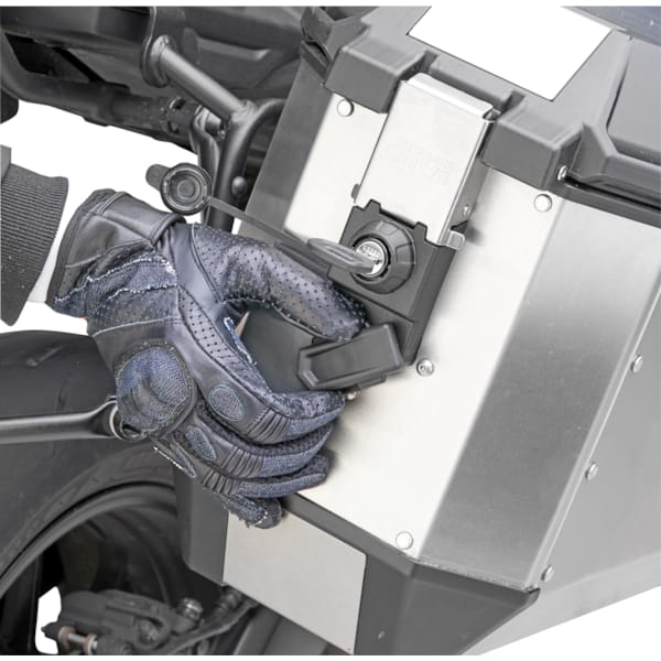 GIVI voorziet daarom minstens één ‘feature’ – patenten zijn in aanvraag – die we graag even verduidelijken. Het HOLD IT EASY® SYSTEM bestaat uit een extra haak die toelaat dat de koffer na het opendraaien van het slot niet plots en onvoorzien tegen de grond gaat. Alles met één sleutel bedienen, het heeft ook nadelen. De haak houdt de koffer in kwestie verbonden met het frame en je kan op die manier zelfs de inhoud in- en-uitladen zonder de zijkoffer helemaal los te maken.