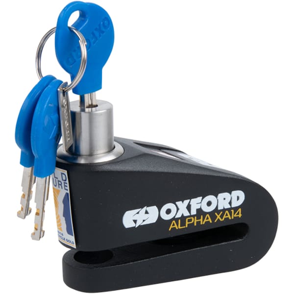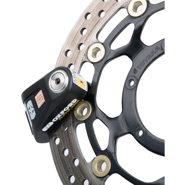 Het Alpha XA14 schijfremslot biedt elke potentiële dief een stevige uitdaging. Oxford voorzag een sluitpen met een diameter van 14 millimeter, een luide alarmtoon en een herinneringskabeltje om te vermijden dat je zelf je spatbord aan flarden rijdt bij vertrek.