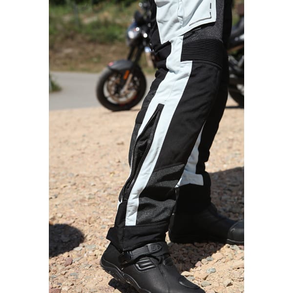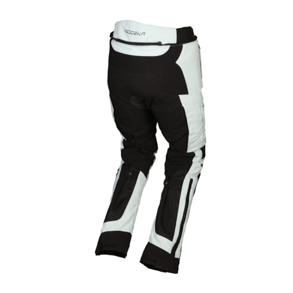 Die combinatie ligt niet voor de hand dus dokterde men een doorwaaibroek uit met waterdicht, verwijderbaar membraan. De Khao Air-motorbroek van Modeka bestaat zowat voor 50% uit scheur- en slijtvast polyamide (450D), aangevuld met 50% mesh. De slijtvaste elementen tellen op de kritieke zones – daar waar je meest nood hebt aan goede bescherming – dubbel. Onder de doorwaaibroek die zo ontstaat, kan je vlot een water- en winddicht Humax®-membraan ritsen. Ventilatieritsen zijn overbodig.