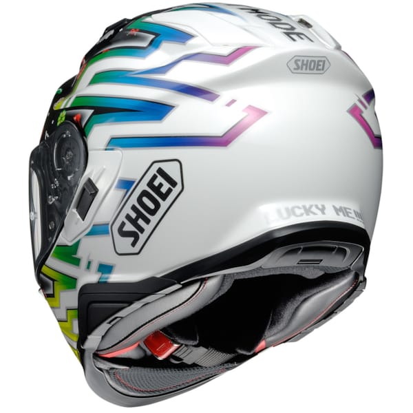 Het interieur kreeg net zo goed een update. Sowieso lijkt het – uitneembaar, wasbaar en zowat volledig te personaliseren – in te zetten op een dubbel doel: goed passen en daardoor geluidswerend werken. 3D, verschillende materialen, individuele stukken die je dikker of dunner kan kiezen, Shoei lijkt binnenin kosten nog moeite gespaard te hebben. Een windafdichting kin en de ruim uitgevoerde nekrand illustreren dat er ook aan de details gedacht werd. De verstelbare en zachte kinband – een Micro Ratchet-sluiting – kan je naar voor brengen om minder druk op de keel te ervaren. O, en ‘Micro Ratchet’, dat is de stainless-steel-ratelsluiting die door Shoei ontwikkeld en gepatenteerd werd, en vooral (ook in nood) snel en vlot te bedienen valt.
