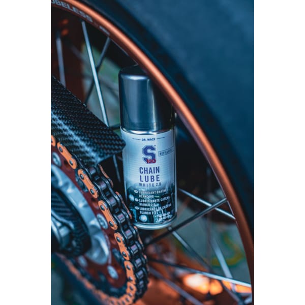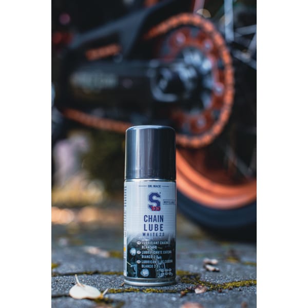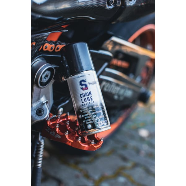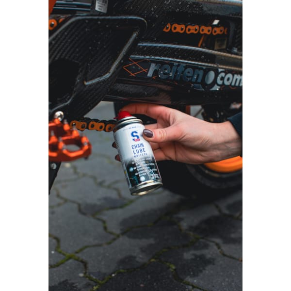 Reinig de ketting geregeld met S100 kettingreiniger. De S100 Kettingspray Spatbescherming (Sauber