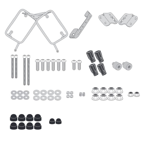 Ooit stimuleerde GIVI het knutsel- en puzzelgevoel met allerhande kits, opzetstukken, adapters en verschillende formaten. Deze zijkofferbeugel pas in de recentere, uniforme aanpak, waarbij de complete set kant- en klaar wordt aangeleverd.