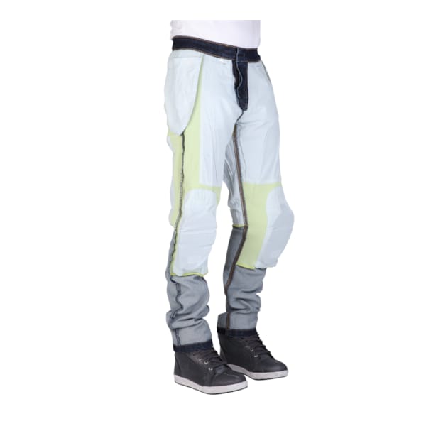 Het is meteen ook een zomerse motorjeansbroek, zonder meer. De buitenkant (aged denim) is niet waterdicht. Onderhuids is deze motorjeansbroek op de kritieke plaatsen voorzien van DuPont™ Kevlar®: heup, knieën en achterwerk krijgen een laag extra. De SAS-TEC-protectoren op de knie zijn vlot te verwijderen, maar ook zo minimalistisch (lees: dun) dat die optie eigenlijk niet eens echt in je opkomt. Een optionele heupprotector SAS-TEC SC-1/07 of SC-1/KA inpassen gaat vlot en snel.