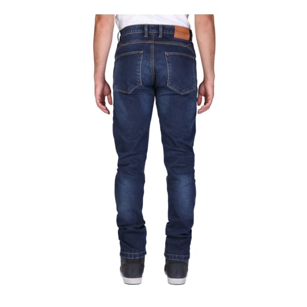 Deze ‘slim fit’ is een strak gesneden en modieuze motorjeans. Een straks gesneden jeans in het algemeen. Met 2% elastaan zit er wat rek op de dingen, maar de buitenzijde is toch vooral katoen. Denim dus, aangevuld met polyester en het slijtvaste Cordura. Geen extra beschermende voering omdat alles ‘gewoon’ meteen in de buitenlaag vervat is. Het levert een solide basis op. En een lichte motorjeansbroek met voldoende beschermende kwaliteiten.