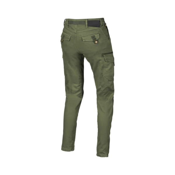 Onzichtbaar maar essentieel in elke zomerse motorbroek, cargo of niet: Aramide, een slijt- en scheurvast materiaal dat ter versterking aan de knieën, heupen en op het achterwerk werd ingepast. Daar waar het schuift, met andere woorden. Het is verweven met het gewone textiel (katoen), waarin ook een dosis stretch schuilgaat. Staan en zitten zijn twee verschillende zaken en dan wil je een beetje extra ruimte om beide af te wisselen.