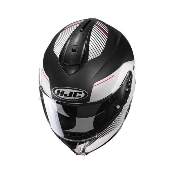 Het transparante vizier is er eentje met 99% uv-bestendigheid – zoals alle HJC-vizieren trouwens – en alles is aanwezig om een Pinlock®-lens te bevestigen. Alleen de Pinlock® zelf ontbreekt. Het vizier is flexibel en laat zich makkelijk verwijderen of vervangen. Achter het transparante exemplaar tref je het geïntegreerde, donkere zonnevizier aan. De bediening daarvan zit bovenaan de helm, in het verlengde van de topventilatie, maar ook met handschoenen is het verschil overduidelijk en laat je het zonnevizier vlot zakken en opnieuw verdwijnen. Het is mist- en krasbestendig, zoals je eigenlijk mag verwachten bij een helm van dit kaliber.