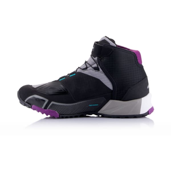 Opbouw, techniek, knowhow, ze zijn er dus, ook in de CR-X Women's Drystar. Visueel mag je hem weliswaar perfect ook in de ‘urban’-categorie stoppen. Of er dus een hele lange sportieve wandeling mee maken. De geavanceerde constructie van deze motorschoenen bevat onder andere fijn meshmateriaal, naadloos ingewerkt in de buitenlaag die vooral uit rubber bestaat. Als geheel levert dat een goed geventileerde, ademende, comfortabele maar al bij al toch ook nog steeds goed beschermende motorschoen op.