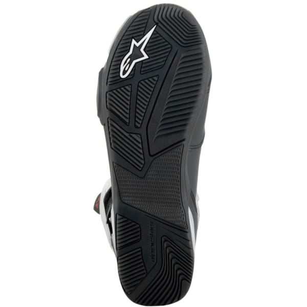 Onderaan vallen de glanzende TPU-hielcover en de teenslider op. Onzichtbaar maar zeker zo belangrijk is het Alpinestars TPF Transversal Protection Frame dat via de zool voorkomt dat je tenen en hiel plots in dezelfde richting wijzen. Het profiel van de zool – met de asymmetrie in de hiel – helpt vooral naast de motorfiets om de stabiliteit en een aangename, natuurlijke pas te behouden. Een uitneembare OrthoLite-inlegzool® en anatomisch EVA-voetbed met lycravoering spelen natuurlijk ook hun rol.
