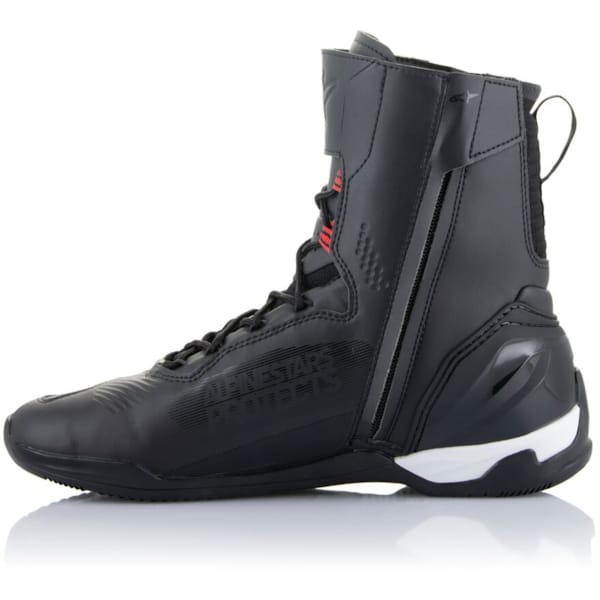 De Superfaster-motorschoen beschermt je volledige voet en de onderste helft van je been. De geïntegreerde onderste scheenbeenimpactbeschermer en vooral het nieuwe, halfstijve, interne enkelbracesysteem met specifieke malleolus-impactbescherming (de malleolus zijn de beentjes die vaakst breken in de enkel) vallen op, net als de strakke, goed aansluitende schacht met de achillespeesbeschermer die uitmondt in een elastische en toch stevige achterzijde.
