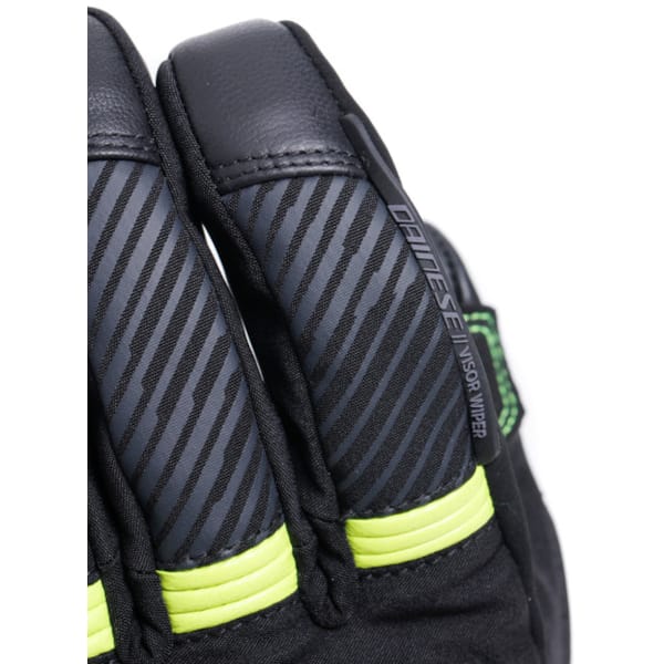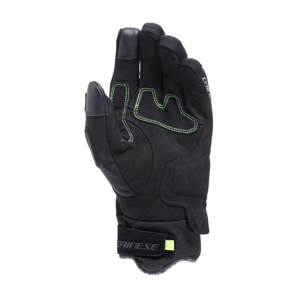 Het basismateriaal is 4-way-stretchtextiel, al mogen we ook de lederen en suède aanvullingen op de vingers en de handpalm niet uit het oog verliezen. De ergonomische Comf-tek knokkelbeschermer in (zacht) visco-elastisch polyurethaan zit de flexibiliteit niet in de weg, integendeel. De manchet – kort, zonder superkort te zijn – bestaat uit Airprene en reikt net tot aan de mouwen van je motorjas. Met een velcrostrip houd je de Fulmine D-Dry-motorhandschoenen netjes op hun plek.