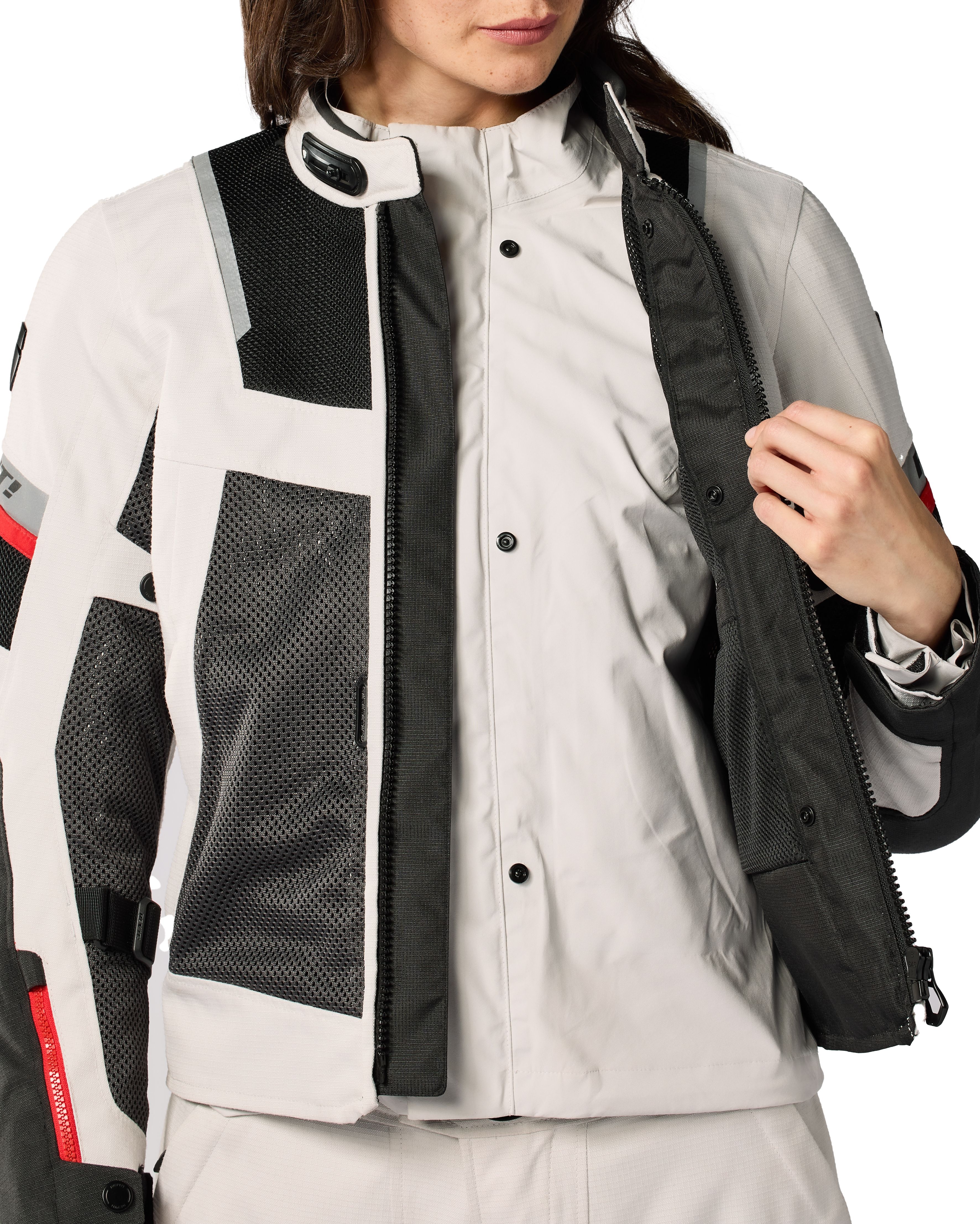 Design, materiaal en allround veiligheid kregen al de nodige updates. De Tornado 4 H2O is vooral het resultaat van een andere kijk op de zaak, en dat resulteert onder andere in het loskoppelen van de voering en het waterdichte membraan. Van elkaar, en van de buitenzijde, in alle denkbare opstellingen en volgordes. Zo ontstaat een 3-in-1 die als extra troef heeft dat je over de optie beschikt om het waterdichte Hydratex 3L-membraan zowel boven als onder de buitenlaag van deze motorjas te dragen, met of zonder de thermovoering. En die laatste kan je ook zonder het membraan aan de buitenzijde bevestigen. Het is een nieuwe, recente aanpak die voor- en tegenstanders kent, en die door REV’IT! eerder ook in de Offtrack toegepast is.