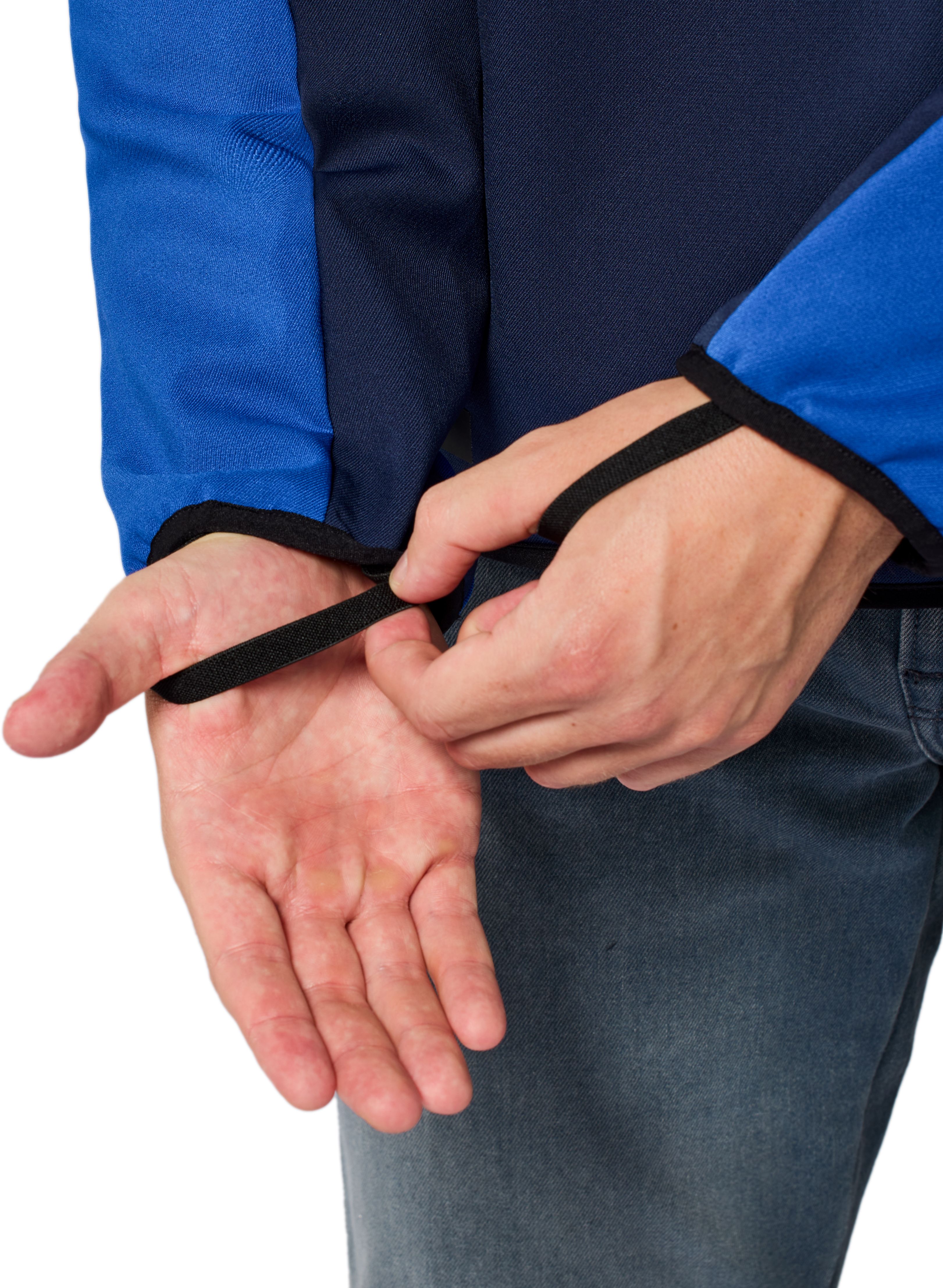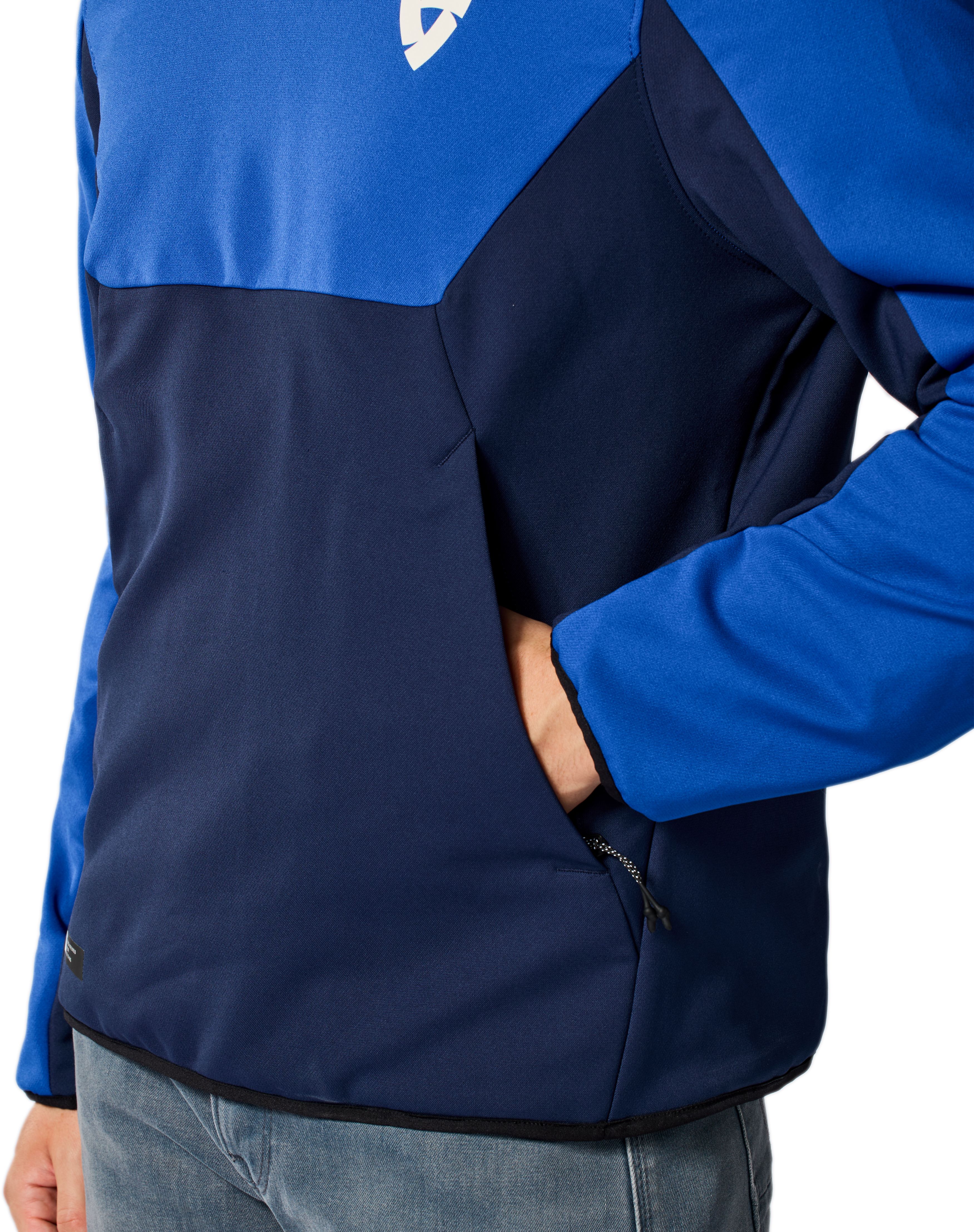 Casual dus. De Andon is uitgerust met een kenmerkende kangoeroe-pocket die je aan beide zijden dicht kan risten. En dus ook aan beide zijden kan bereiken. Het is in elk geval een voldoende ruime opbergzak om een en ander bij te hebben onderweg. Opnieuw veel ‘hoodie’ en toch een toevoeging die het gebruik ervan op de motorfiets praktisch maakt. Je kan datzelfde ook over de capuchon zeggen. Die is vast aanwezig, maar met de drukknoop klik je ze wel vast om op de motor geen vervelend gewapper te creëren. In dezelfde lijst met praktische accenten staat de jeanslus waarmee je de Andon vastmaakt aan je motorjeansbroek en voorkomt dat je met ontblote rug onderweg bent. Er is ook een korte verbindingsrits en de duimlussen hebben op een andere plek een gelijkaardige functie.