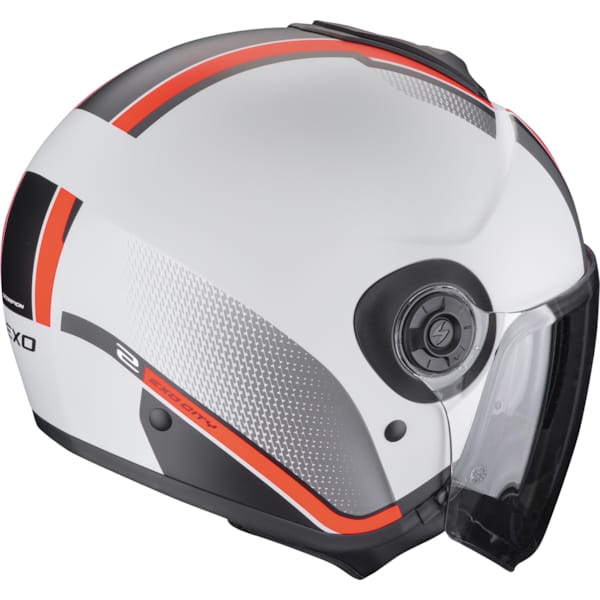 Van kinstukken en de daarbij horende kinventilatie is om evidente redenen geen sprake: het maakt de jethelm die de EXO-City II is wellicht ook een eerder zomerse keuze. Het hoofd koel houden doe je dankzij de ruime topventilatie die voldoende frisse lucht naar binnen hapt. De schuiver bedien je natuurlijk net zo makkelijk met als zonder motorhandschoenen. De binnenvoering (EPS/ Kwickwick® van de Scorpion EXO-City II is een vochtwerende, antibacteriële en aangenaam zachte variant, wat transpiratie tot een minimum beperkt en meteen ook alles hygiënisch houdt. Er zijn uitsparingen voorzien voor eventuele speakers.