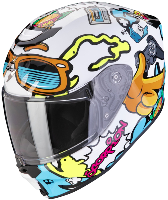 Deze integraalmotorhelm voor kinderen heeft een buitenschaal in polycarbonaat en voldoet aan de recentste ECE22.06-certificatie. Omdat kinderen groeien en motorhelmen niet, integreert SCORPION hier het ‘Airfit’-systeem waarmee je de lucht in de wangkussens door middel van een luchtpompje kan bepalen. In elke richting en zo vaak als nodig. Het zorgt voor een perfecte pasmaat en een langere levensduur.
