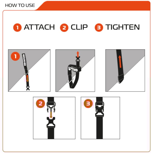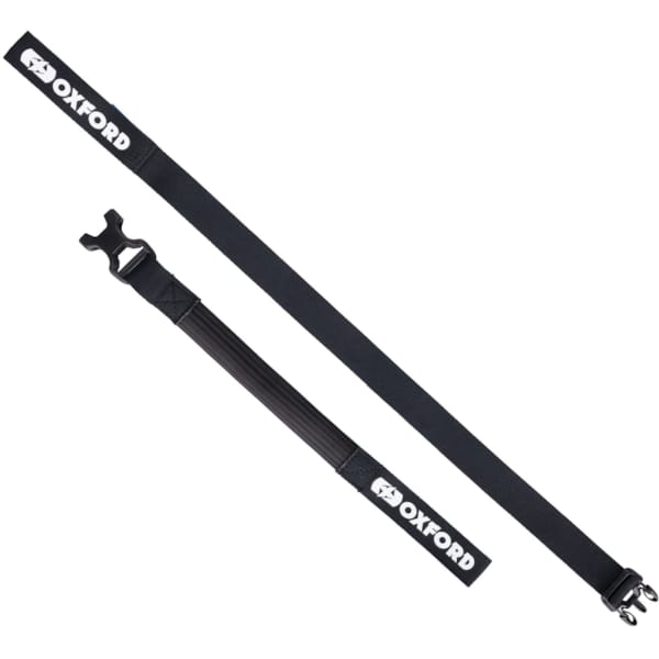 Er zijn een aantal mogelijkheden om bagage vast te maken op een motorfiets. Eén van de meest handige – en bedrijfszekere – opties is deze combinatie van een gewone, in lengte verstelbare riem en een robuuste elastische band, gescheiden door een snelsluiting. Je bevestigt beide delen door middel van een lasso-lus of een aanwezige haak op de motorfiets, om nadien de snelsluiting te gebruiken en aan te spannen volgens noodzaak.