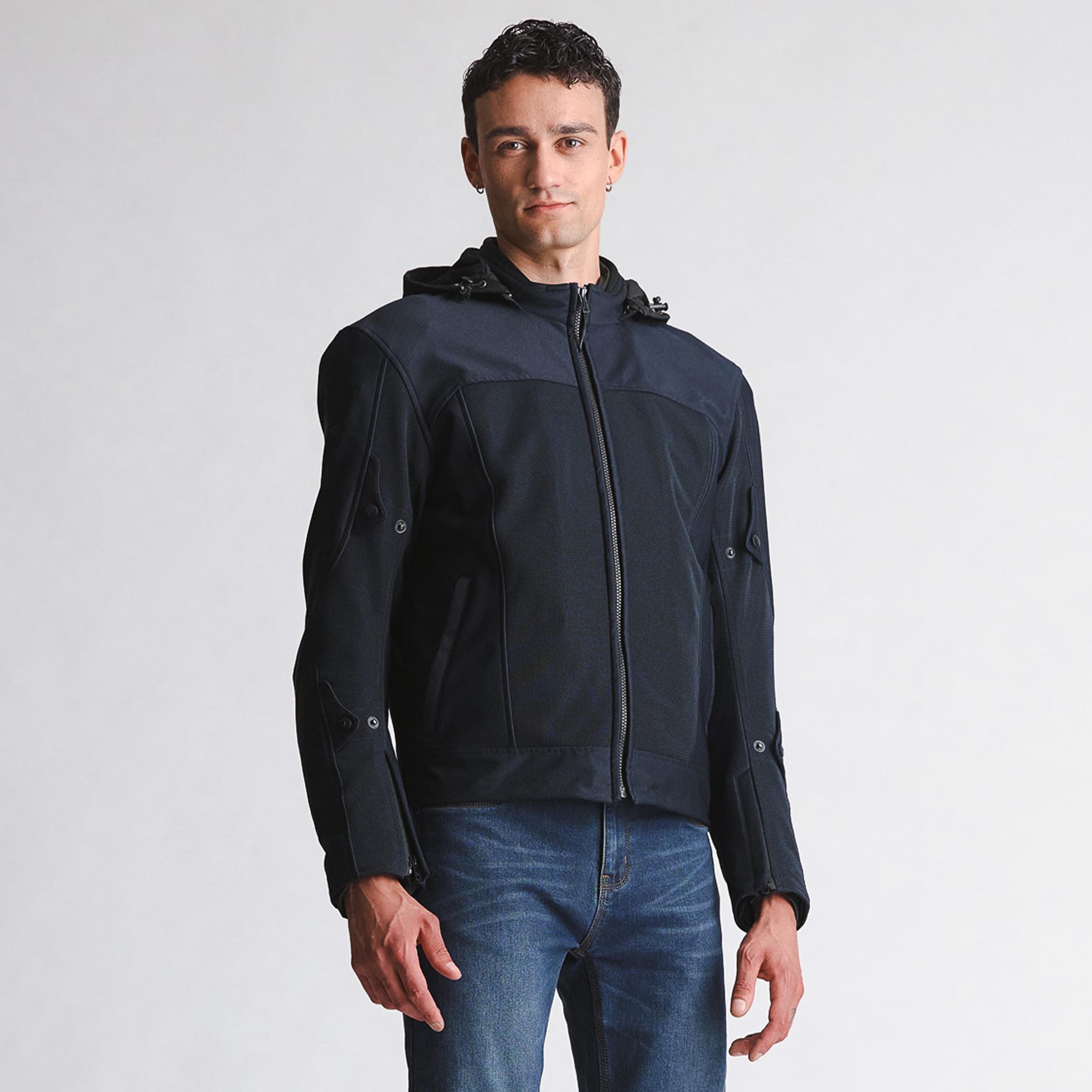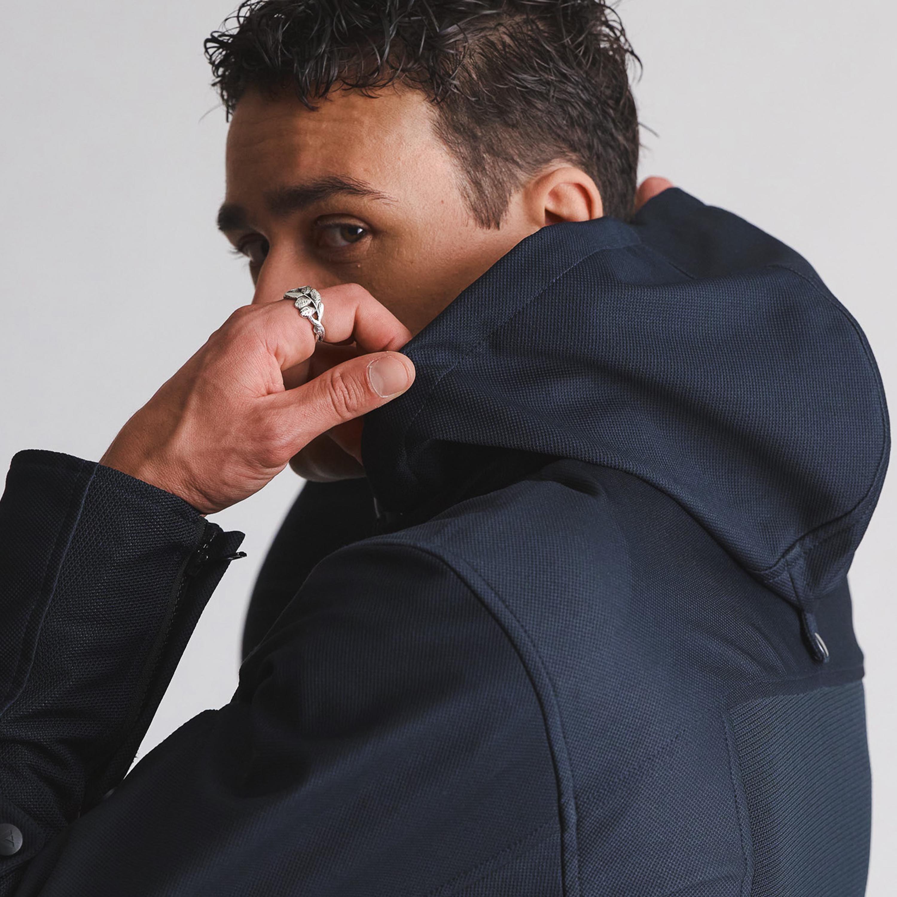 De buitenzijde van de Davey Air bestaat behalve uit meshpanelen vooral uit softshell. Het geeft deze motorjas een zachtaardig voorkomen. De verwijderbare capuchon doet er nog een schepje bovenop en zonder motorfiets in de onmiddellijke buurt ga je helemaal op in de (stedelijke) omgeving. Je kan de capuchon met een drukknop achteraan vastmaken om onderweg al te veel geflapper te voorkomen. Dit is een motorjas die je ook ‘gewoon’ zal aantrekken, neem het van ons aan. Het blijft voor alle duidelijkheid wel motormateriaal: slijtvast en gecertificeerd, met een set B-PROTECT level 2-protectoren op de schouders en ellebogen. Die zijn – je raadt het – zacht en meegaand. Wie iets meer stevigheid verkiest, kan zelf een CE-gecertificeerde rugprotector toevoegen.