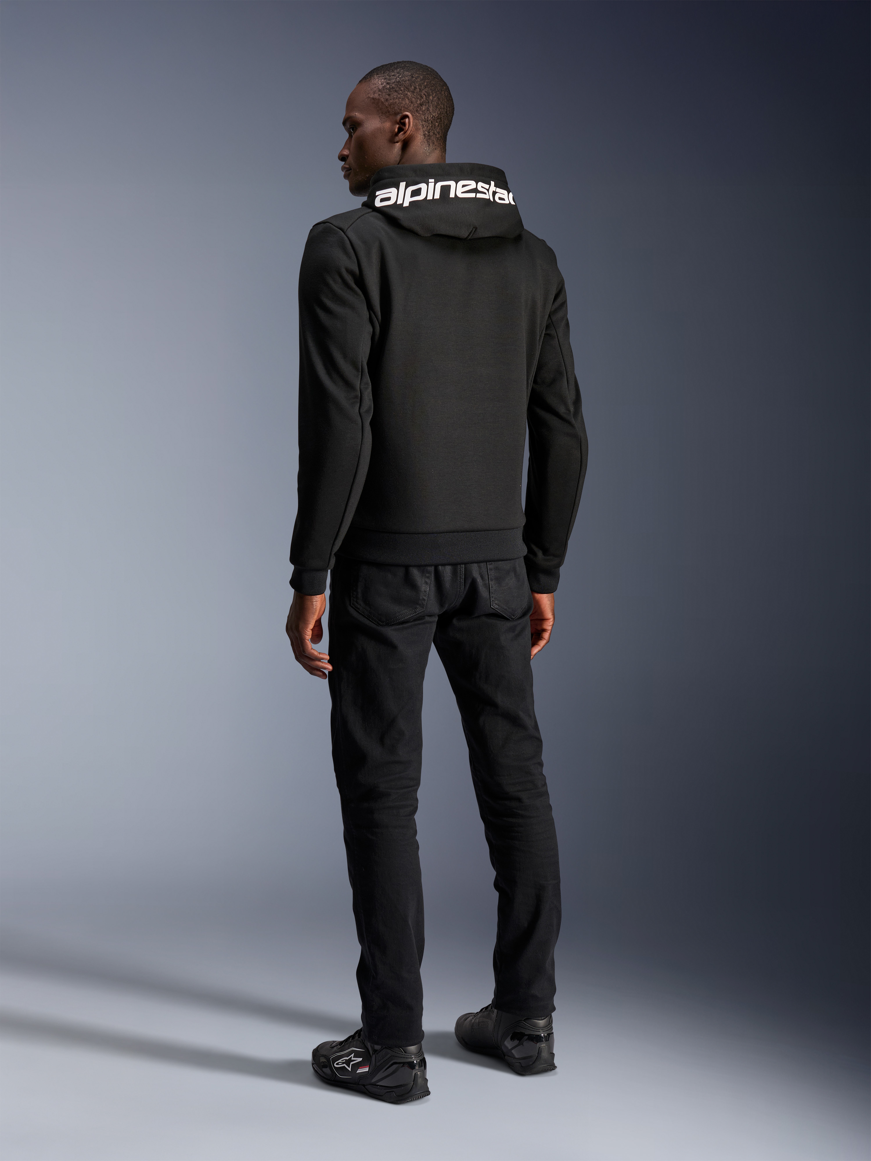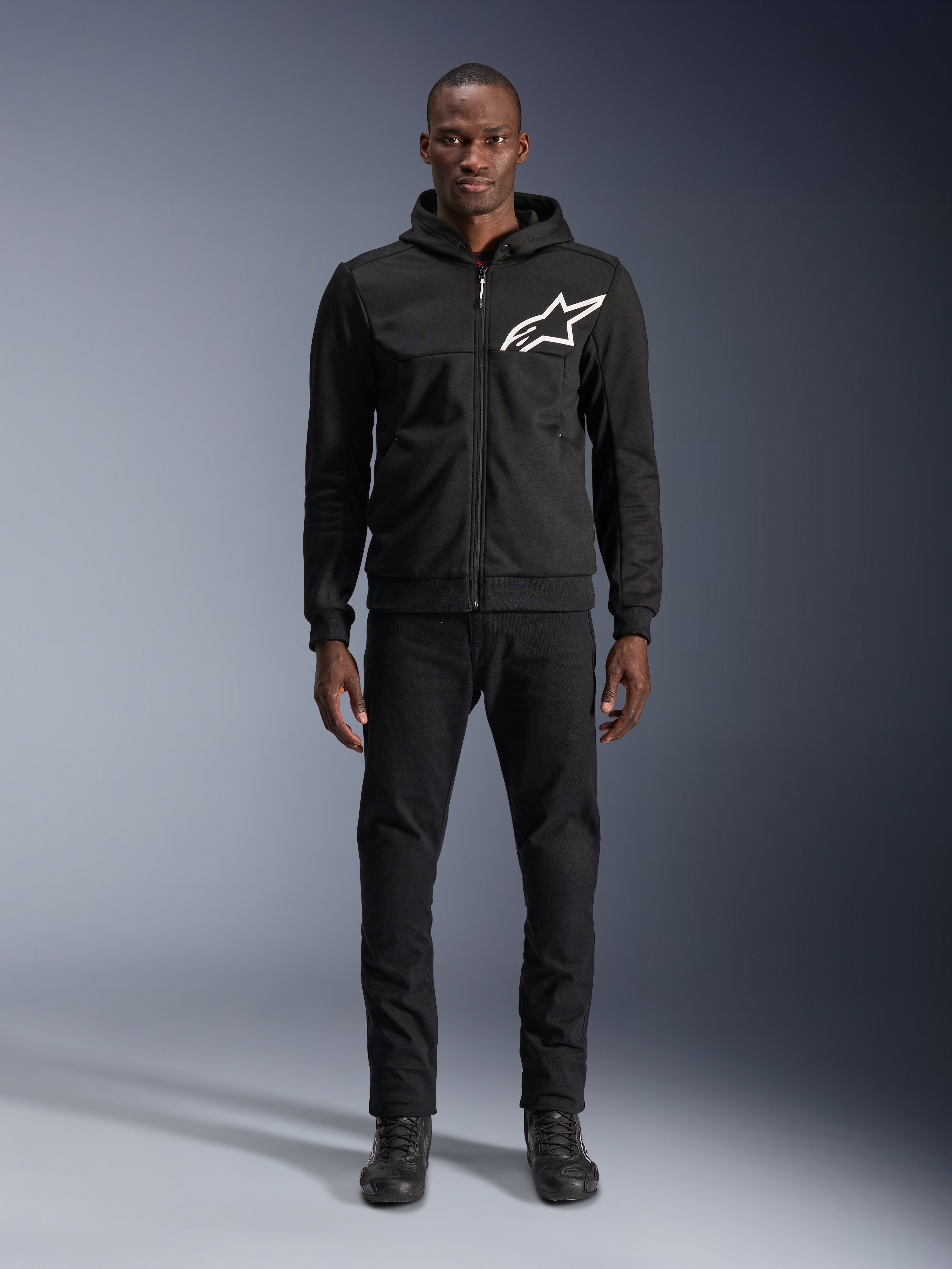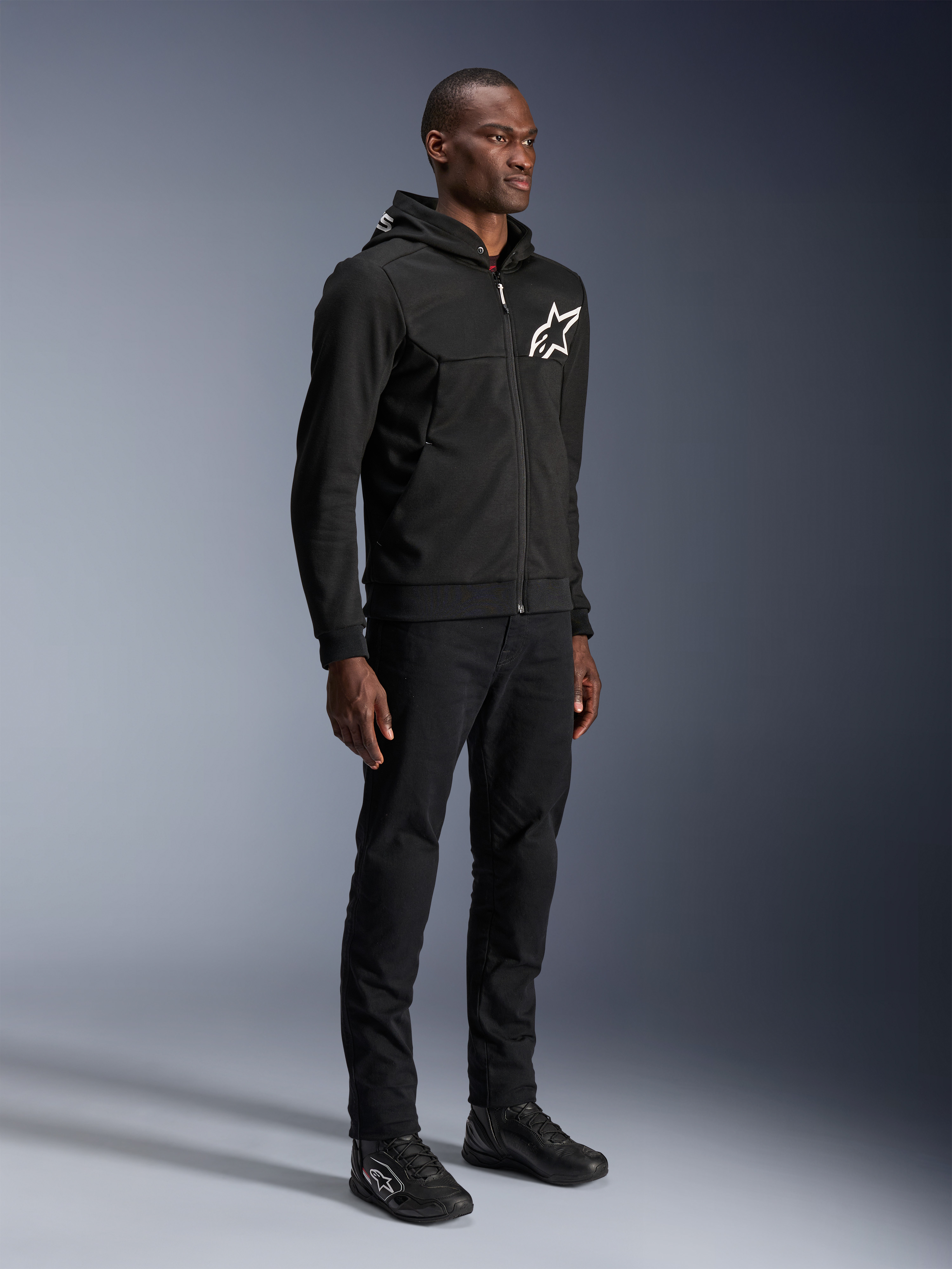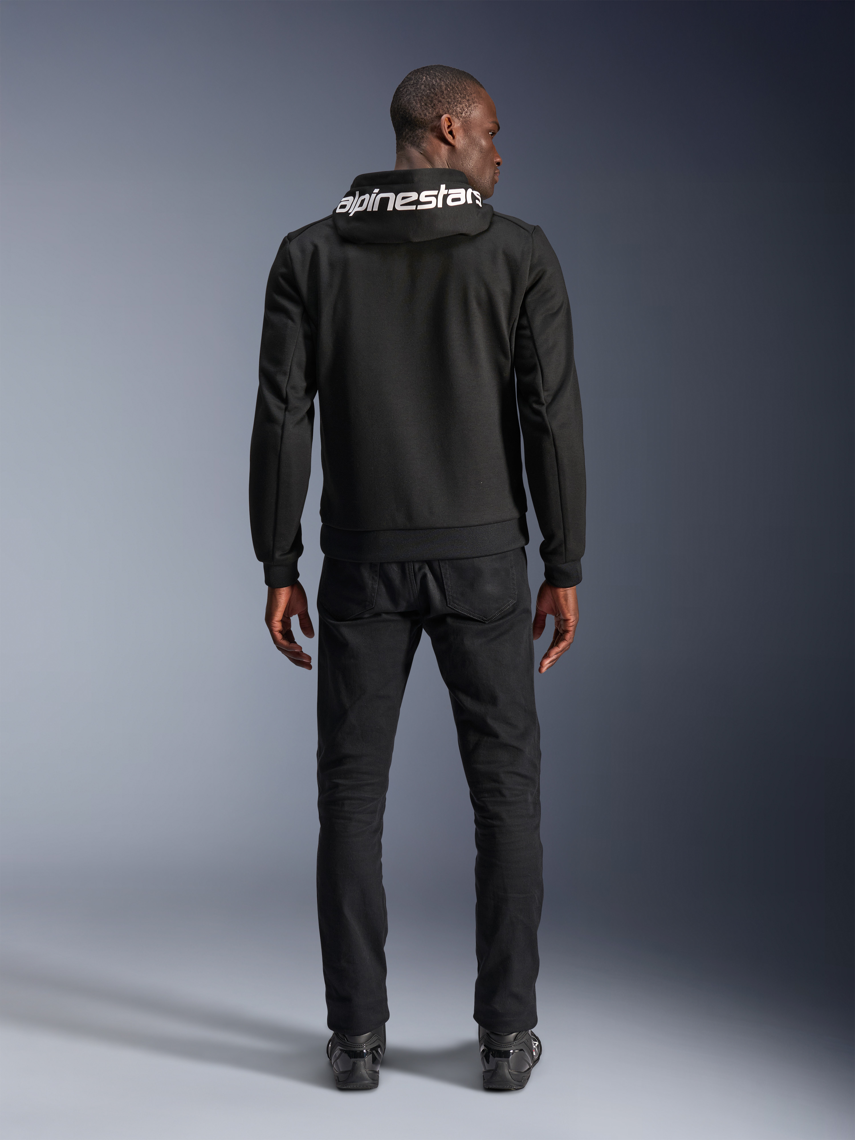 In de Chrome V2 Sport motorhoodie zit verrassend veel – nou ja, het blijft Alpinestars – water- en windwerende technologie verwerkt. De buitenzijde lijkt qua uitzicht wat op softshell maar is dat niet. Tech fleece, zo heet het, en het gaat wel degelijk om een duurzaam, comfortabel en licht textiel, aan de binnenzijde versterkt met aramide voor extra scheur- en slijtvaste eigenschappen.