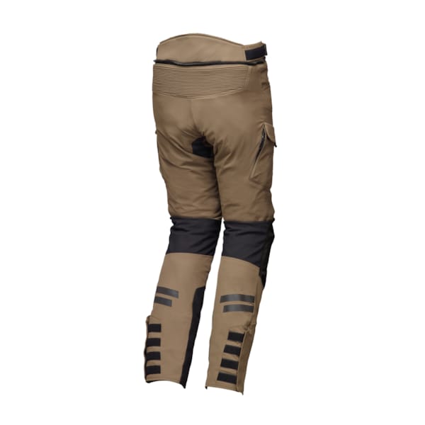 De buitenzijde uit 400D-ripstop vormt een stevig basis om het Humax-membraan en de thermovoering aan op te hangen. Een rechtstreekse ventilatieopening heb je net zo goed. De ritsen aan de zijkant van de cargopockets gunnen de bovenbenen op die manier een pak rijwind. Let een halve meter lager trouwens ook op het ‘klevende’ materiaal dat je kuiten beschermt tegen stralingshitte én dat ondertussen het contact met de motorfiets gaaf houdt.