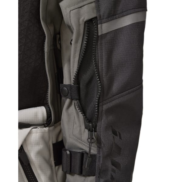 De verwijderbare thermovoering kan zonder het waterdichte membraan vastgeklikt worden aan de buitenste schaal van de motorjas. Die buitenste schaal kan ook de middelste worden, wanneer je het membraan boven de motorjas draagt. Soit, we maken het nodeloos moeilijk: de mix van mogelijkheden laat zowat alle combinaties en volgordes toe. Lopen de temperaturen té hoog op, dan zijn de ventilatiemogelijkheden voor armen en torso nog verbeterd. De panelen op de borst en de rug zijn ruimer dan ooit, al kan je ze ook halveren door middel van een goed geplaatste drukknop. Alweer: eigen keuze. Ventilatieritsen lopen over de (bijna) volledige lengte van de arm en achter de centrale rits krijg je een ventilatieflap te zien waarmee je nog eens een complete verticale ventilatieopening creëert.