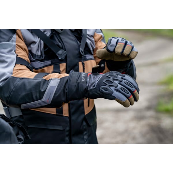 De Tyrian RTX-motorhandschoen is voorzien van een Ergothumb-constructie, wat in de wondere wereld van Macna betekent dat de duim en wijsvinger zijn gemaakt van één en hetzelfde paneel, waardoor de naden en drukpunten geen belemmering vormen. Op de vingertoppen van beide wijsvingers is warmtegeleidende stof aangebracht. Dankzij de Touch Tip bedien je de nodige touchscreens zonder je motorhandschoenen uit te trekken.