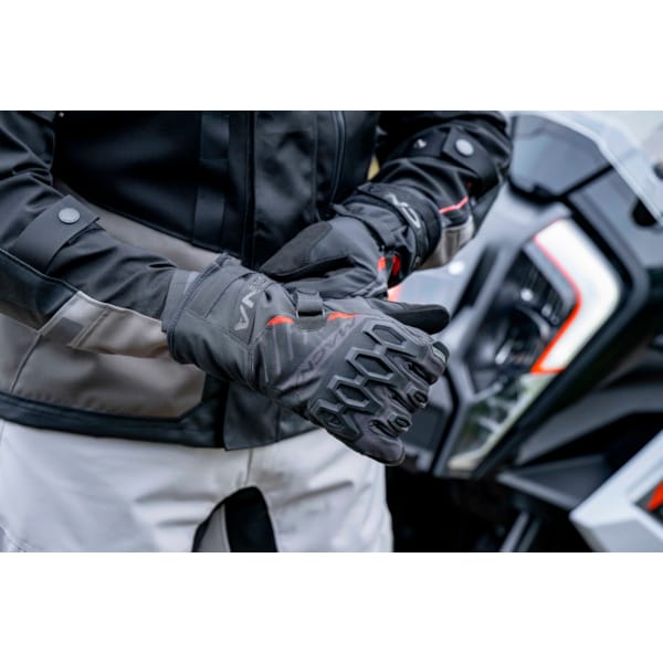 De Tyrian RTX is een lange, waterdichte motorhandschoen met een versterkte lederen handpalm en EXO RISC-bescherming bij de knokkels. Laat de koude ritten maar komen.