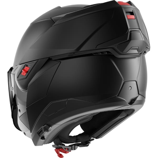 Het moet ook gezegd dat elke volgende generatie van dit type ‘flipback’-motorhelmen strakker en beter wordt. Hadden de eerste edities nog een opvallend breed kinstuk (het moet over de motorhelmschaal heen) dan is dit alweer een duidelijke evolutie. Het mechanisme om de SHARK OXO onderweg te transformeren, bevindt zich vooraan op het kinstuk. De dubbele rode knop moet ook dubbel gemanipuleerd worden: trekken én duwen. We doen het moeilijker klinken dan het is, maar het is wel een pak veiliger. In volledig opengeklapte versie kan je de SHARK OXO door middel van een rode schuiver aan het linker scharnier vastklikken.