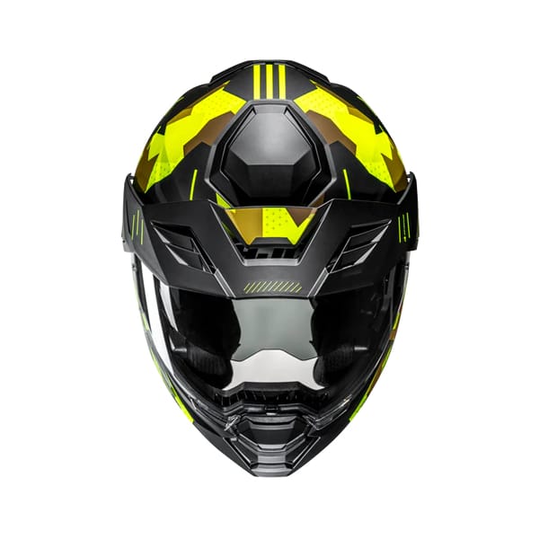 De zonneklep en het transparante vizier bewegen perfect mee in de op- en neerwaartse beweging waardoor je met één enkele ingreep altijd in de meest praktische opstelling terechtkomt. Het transparante vizier is een 'Pinlock Ready' HJ-44 Vizier. Het biedt 99 % UV-bescherming en is anti-kras gecoat. De Pinlock-lens wordt meegeleverd. De zonneklep is verwijderbaar, al zal je het stabiele en weinig windweerstand biedende karakter ervan wellicht voldoende waarderen om ze gewoon te laten zitten. Je beschikt over een geïntegreerd 'dark smoke'-zonnevizier. De bediening zit links onderaan en het geïntegreerde zonnevizier is maar liefst 8 mm verstelbaar.