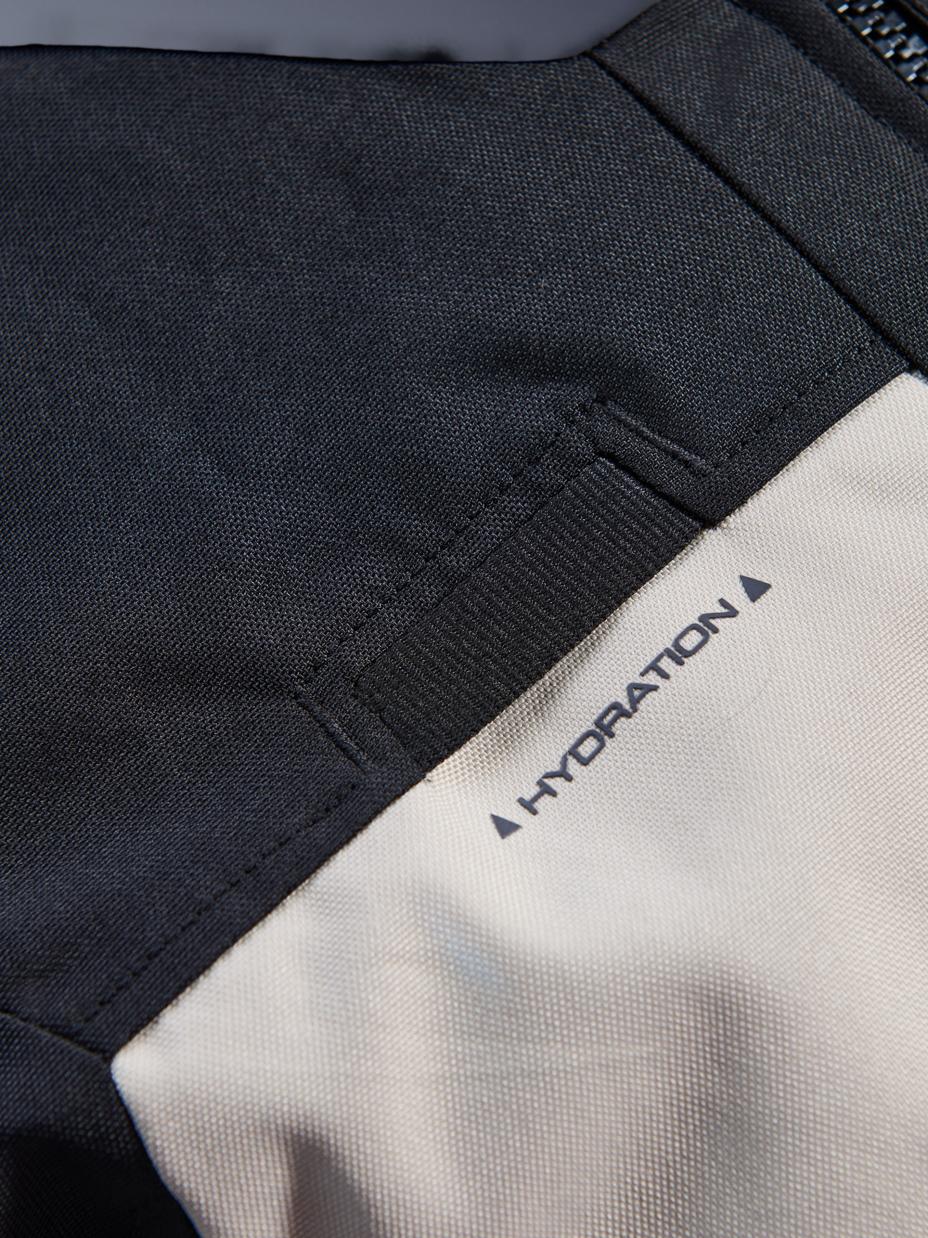 Opbergruimte is ruim voorzien: meerdere waterafstotende zakken, twee binnenzakken en een groot opbergvak op de onderrug. Een hydratatieslang-lus op de borst maakt het systeem compleet voor lange ritten. De waterafstotende cargozakken hebben een geïntegreerde snelle-toegangszak.