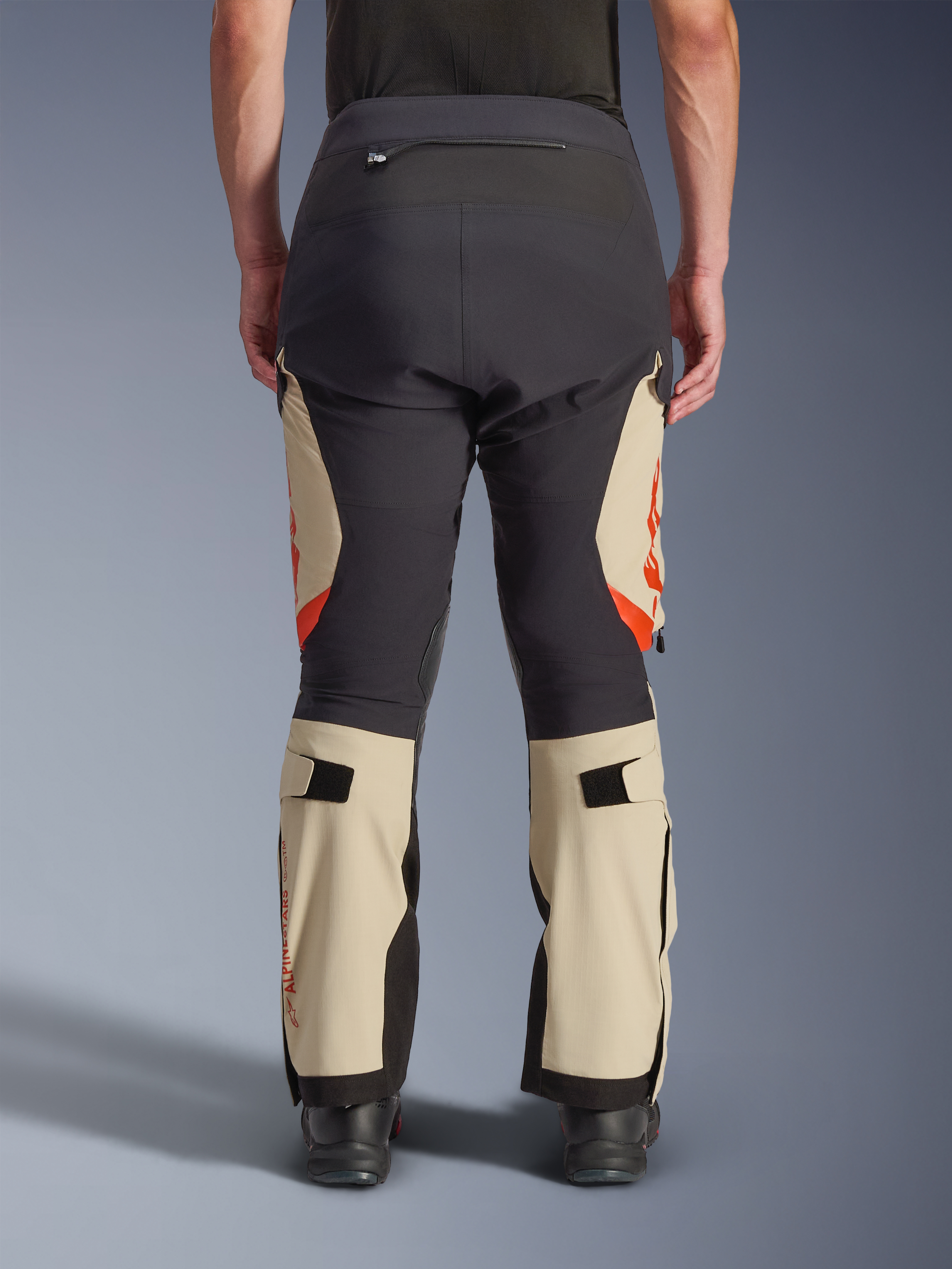 Dit is duidelijk een motorbroek die adventure-rijders zal aanspreken. De geitenleren inserts aan de binnenzijde van de knieën leveren optimale grip op de tank en extra duurzaamheid. PU-verstevigingen op de knieën, ripstop-materiaal ter hoogte van het zitvlak en dobby-versterkt nylon op scheen en enkels zorgen voor extra slijtvastheid in veeleisende zones. De kuitmaat-verstelling met rits past zich aan zowel adventure- als MX-laarzen aan. Dat is geen detail: het maakt het verschil tussen een motorbroek die werkt en een motorbroek die in de weg zit.