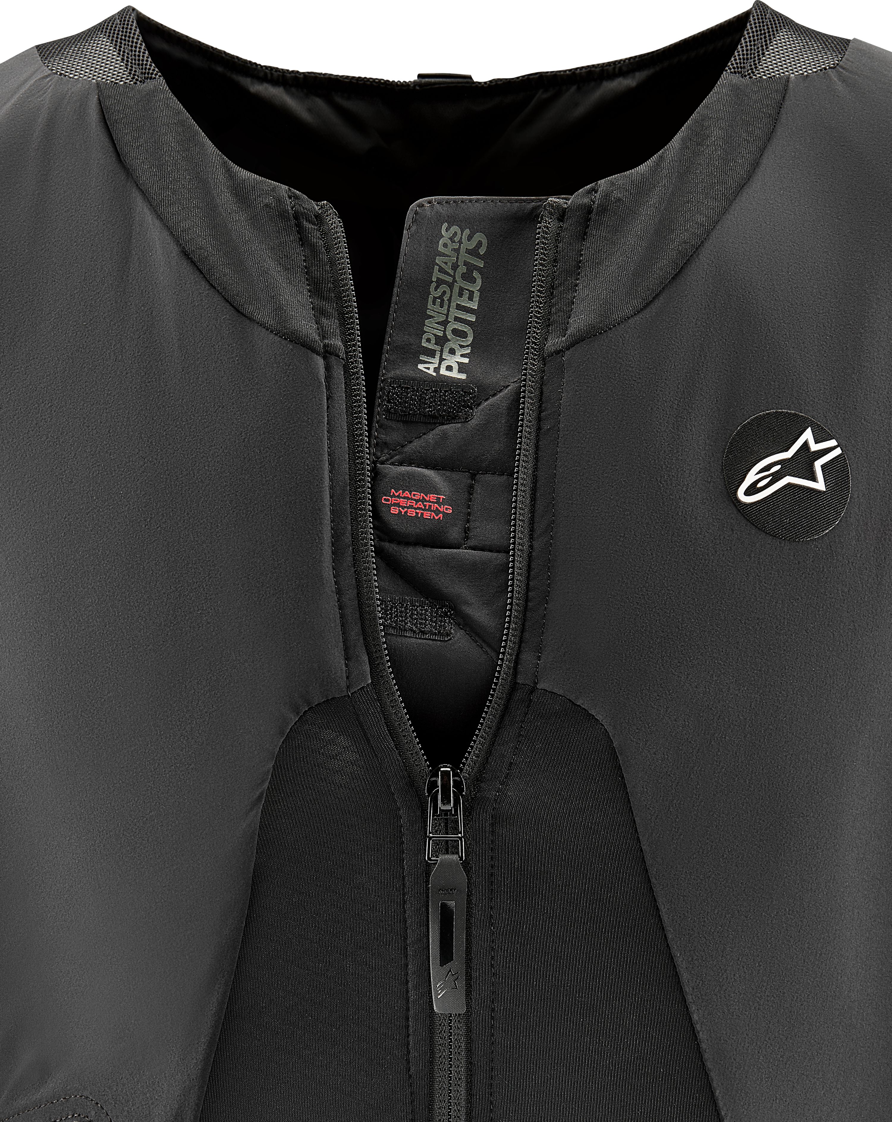 De activatie van het hele systeem gebeurt simpelweg door het Tech-Air 5 Plasma Airbag System aan te trekken en dicht te ritsen. De magnetische verbinding op de borst werkt als aan-knop. Ook zonder dat je erin zit trouwens, dus je vouwt die flap naar binnen om contact te vermijden wanneer je alles opbergt.