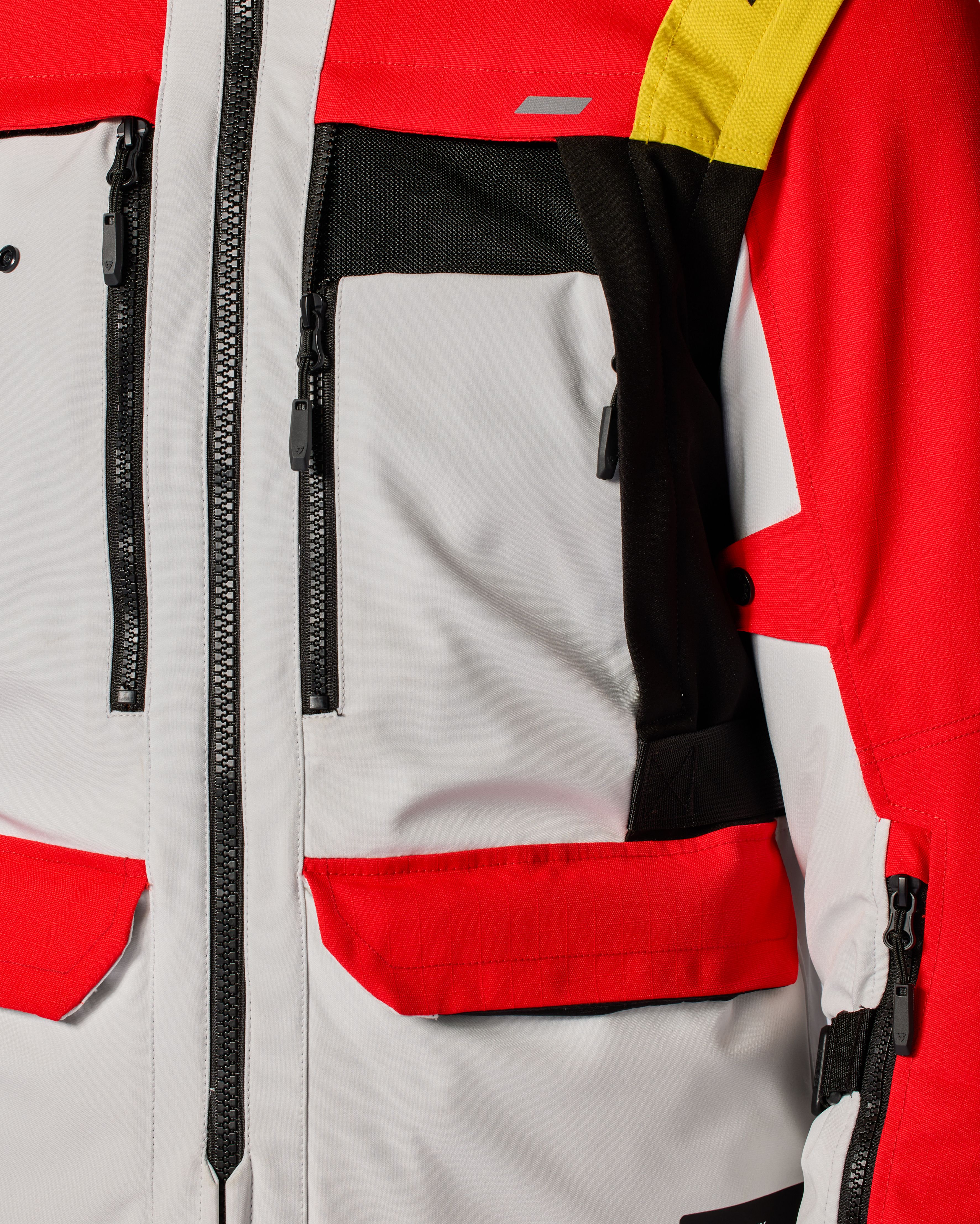 De waterdichte Offtrack 3 H2O bestaat eigenlijk uit drie motorjassen. Van binnen naar buiten vind je een verwijderbare thermovoering. Daarboven zit de waterdichte H2O-laag uit de naam: een verwijderbaar, waterdicht hydratex|3L-membraan dat je zowel in als boven de beschermende buitenlaag kan dragen. Die is opgebouwd uit Softshell, slijtvaste polyester 600D ripstop, ruime ventilatieperforaties en strategisch geplaatste meshpanelen. Het levert een evenwichtige mix op die bescherming, ventilatie en flexibiliteit combineert.