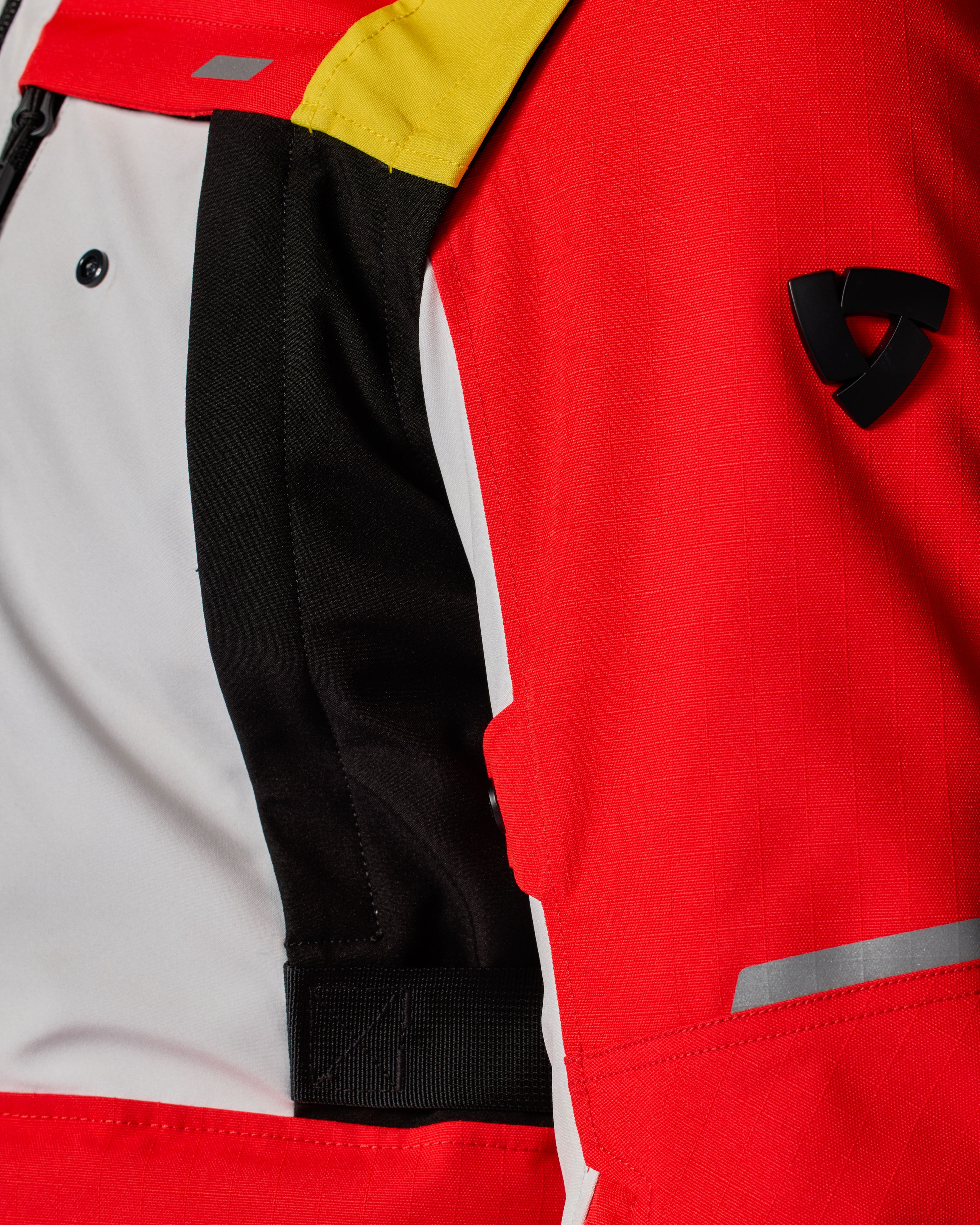 De snit? Iets langer dan wat je bij een sportieve motorracejas krijgt. REV'IT! blijft trouw aan z'n filosofie: strak en nauw aansluitend, zonder benauwd te worden. Je krijgt een motorjas die goed om het bovenlichaam sluit, ongeacht de lagen en combinaties. Verstelmogelijkheden zijn er volop: centrerende riemen met schuifgespen op de flanken, schuivers op de onderarmen, drukknopen op de bovenarmen, een verstelbare flexisnap-kraag en een trekkoord onderaan. Je past de Offtrack 3 H2O aan naar jouw lichaam, niet andersom.