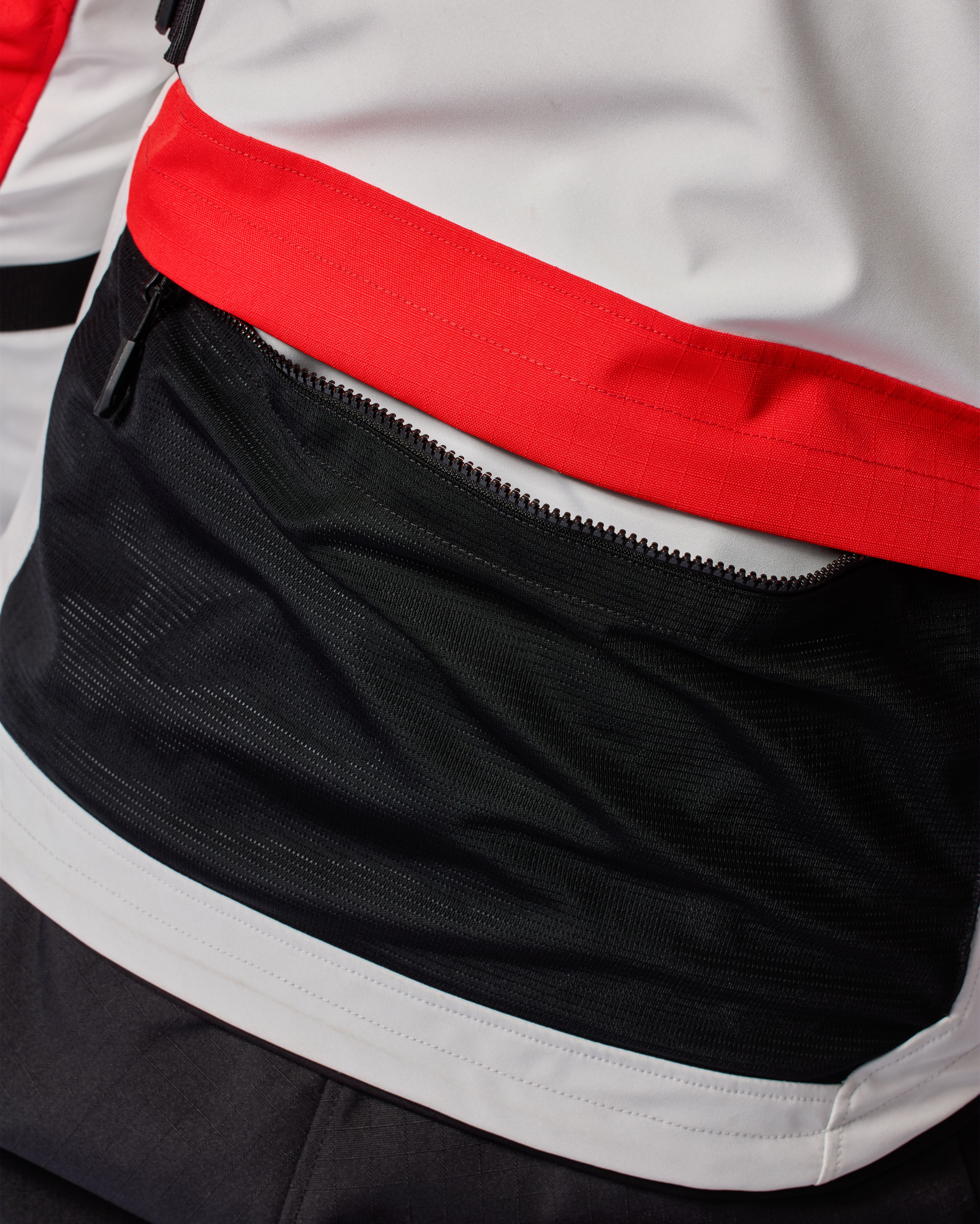 Opbergruimte is er voldoende. Twee grote zakken vooraan (niet 100% afsluitbaar), twee ventilatiepanelen waarin wij nogal vaak onze zonnebril mikken, een ruim cargovak op de onderrug om bijvoorbeeld een membraan in op te bergen, en minstens één binnenzak in elke laag.