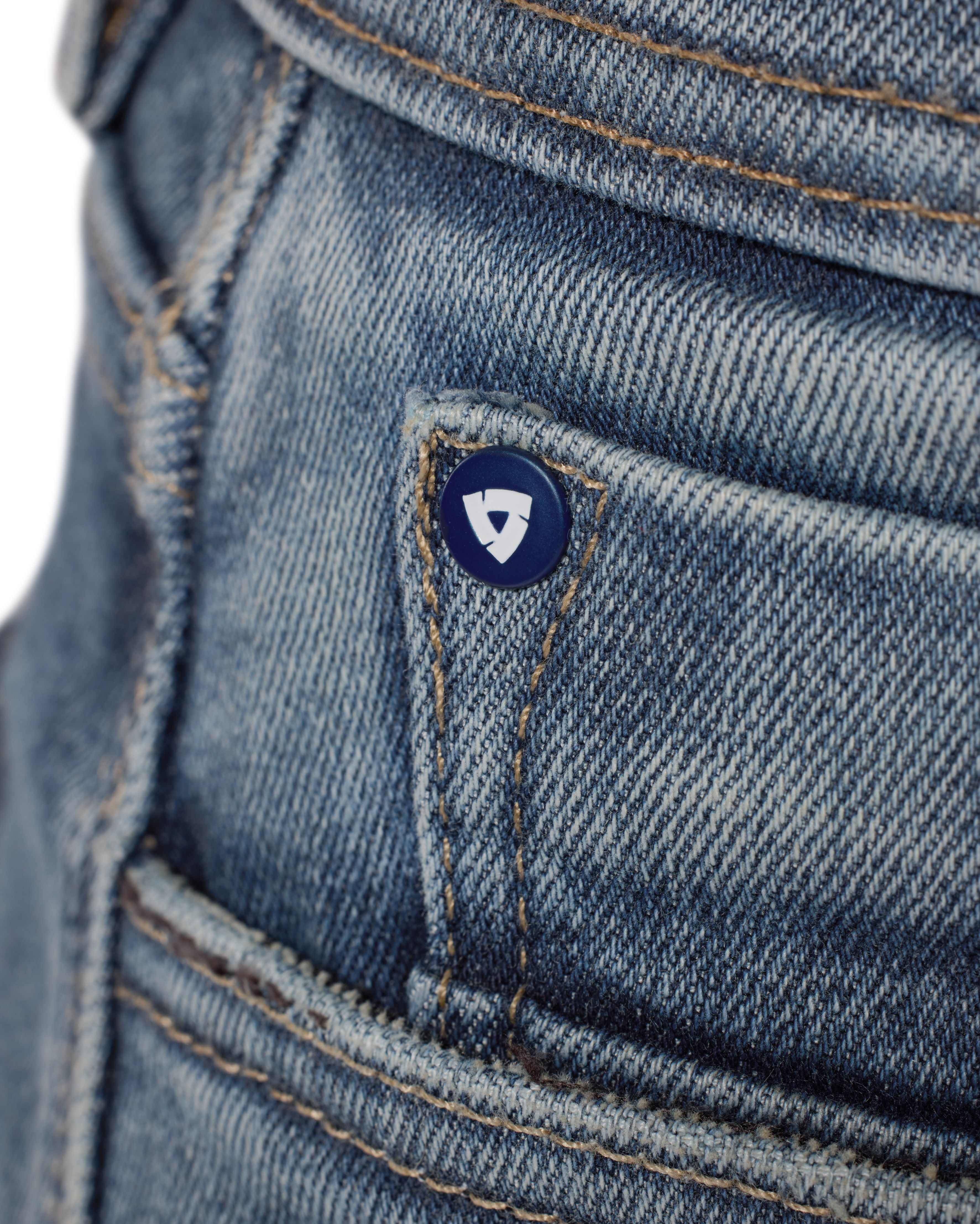 Let op de details die gebleven zijn. De kleur van de rivetnagel en het REV'IT!-logo aan de binnenzijde van de centrale knoop signaleert nog altijd de CE-certificatie van deze motorjeansbroek. Rood is klasse AAA (en dat is ook de klasse van leder), met blauw kom je aan AA en in het zwart blijft klasse A nog altijd overeind als veilig. Voor wie dat niet zo heel veel zegt: dit blijven motorjeansbroeken, geen motorracepakken. Toch is zelfs een gecertificeerde A-klasse altijd beter dan een traditionele jeansbroek en mag je bij de AAA-klasse de slijtvastheid nog dubbel zo hoog inschatten. Een AA, zoals deze Detroit 3 Tapered, zit daar dan logischerwijs ergens tussenin.