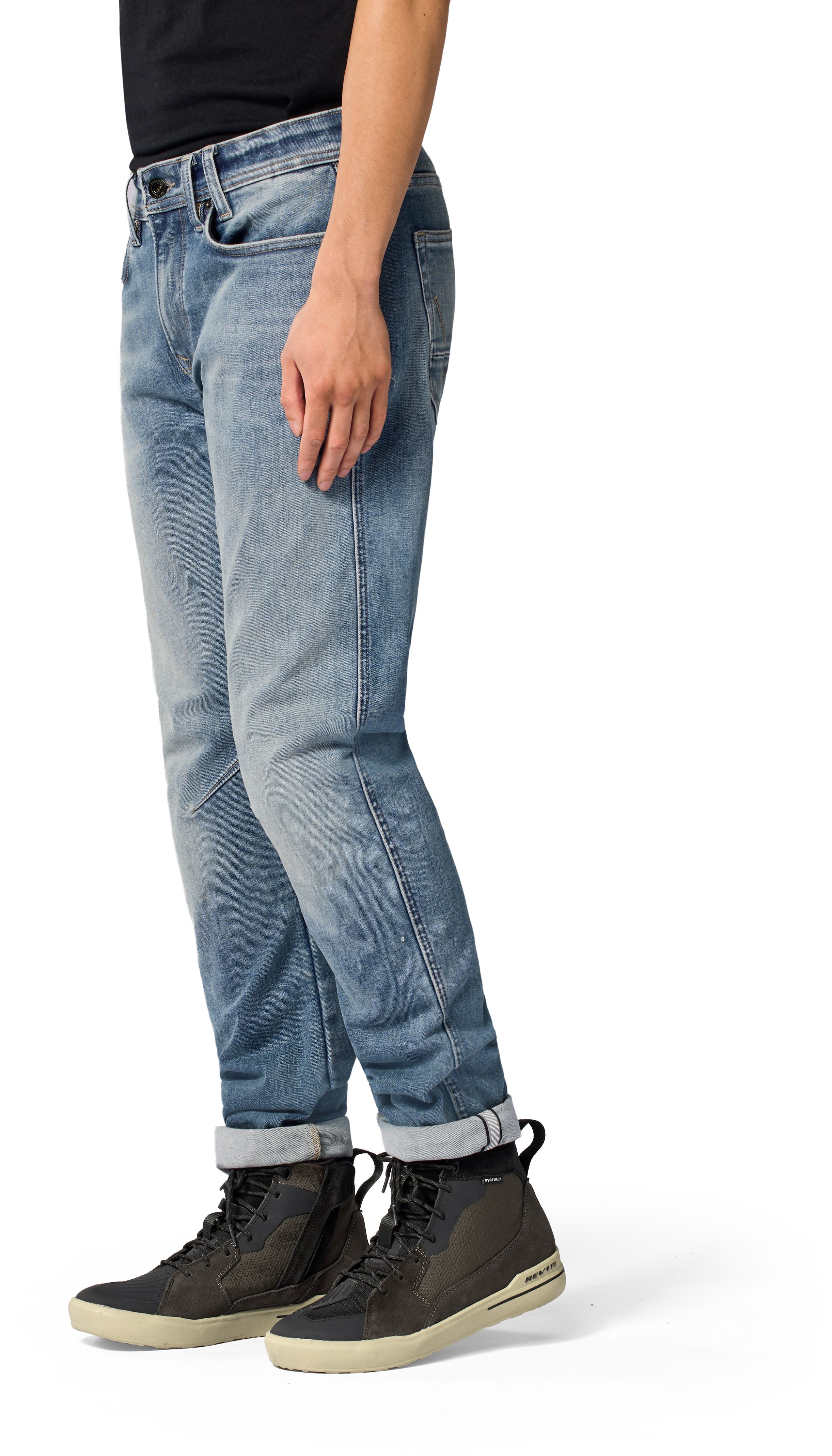REV'IT! kiest voor een laser-washing-procedé, wat behalve uitstekende visuele resultaten vooral geen vroegtijdige slijtage aan het denim oplevert. Dat denim komt in kleuren en maten, en die kunnen naargelang smaken verschillen. De Detroit 3 Tapered bestaat in verschillende washings en is beschikbaar in maar liefst vier (!) lengtematen. Perfect voor de stretchy, licht verweerde look van een oerdegelijke motorjeansbroek.