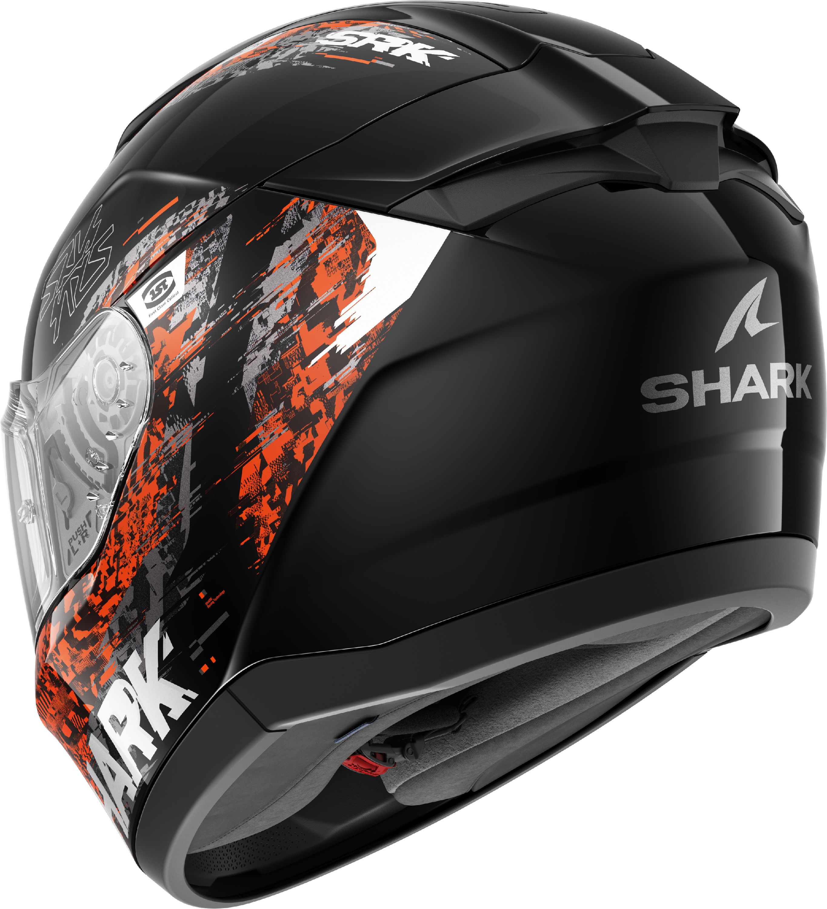 Het lijnenspel is netjes. Niet te scherp, niet te opvallend, precies zoals het hoort bij een motorhelm. Het transparante vizier kreeg een centrale sluiting en laat zich verder omschrijven als ‘krasvast, klasse 1, kan tegen een duw en is voorzien om een Pinlock® 70-lens te bevestigen’. Die laatste is optioneel extra te bestellen, iets wat in deze prijsklasse niet helemaal mag verbazen. Het gepatenteerde scharnier ziet er een beetje uit als een (Frans) uurwerk en laat toe dat je sneller van vizier wisselt dan van onderbroek. En in beide gevallen kan het zonder gereedschap.