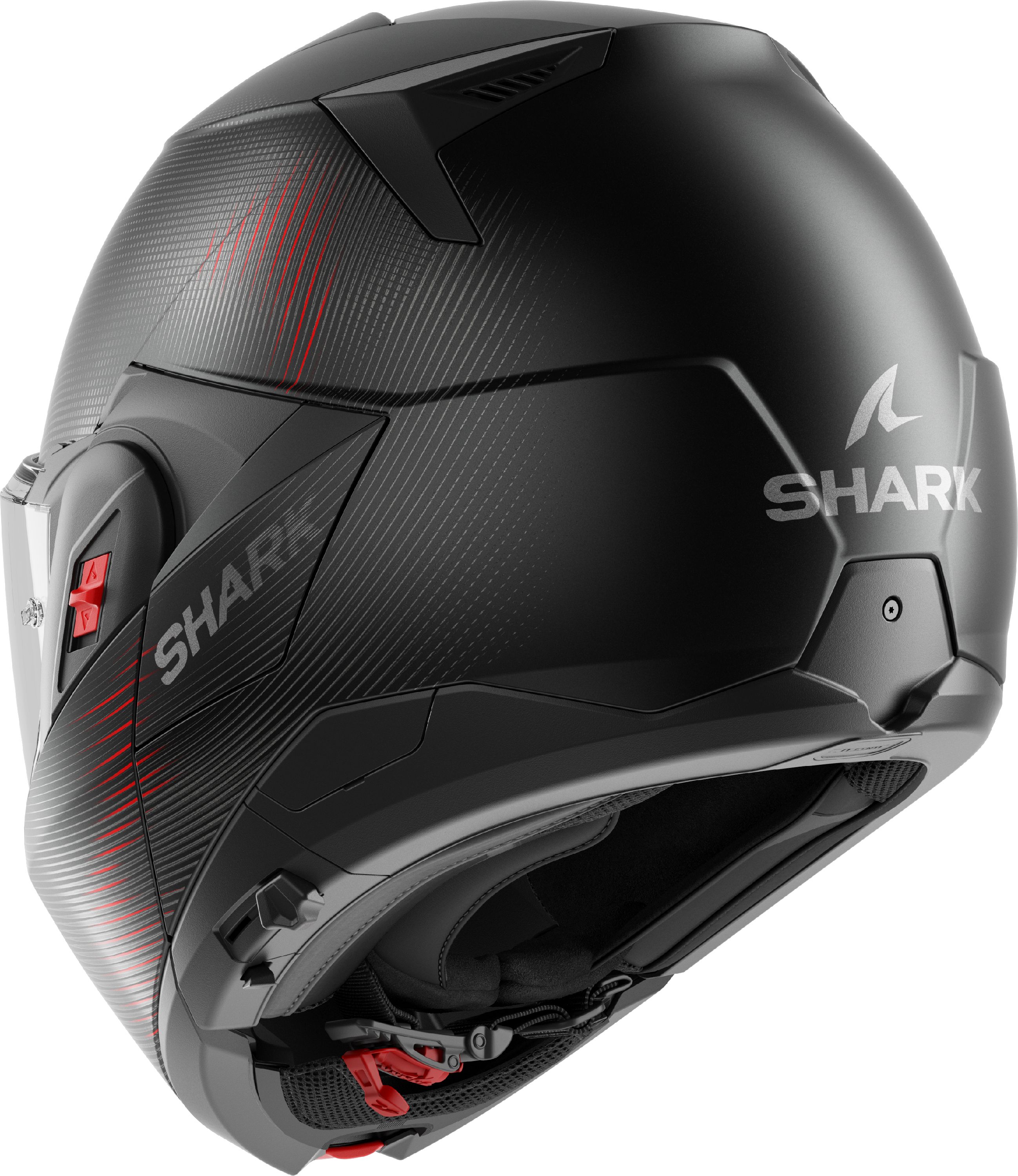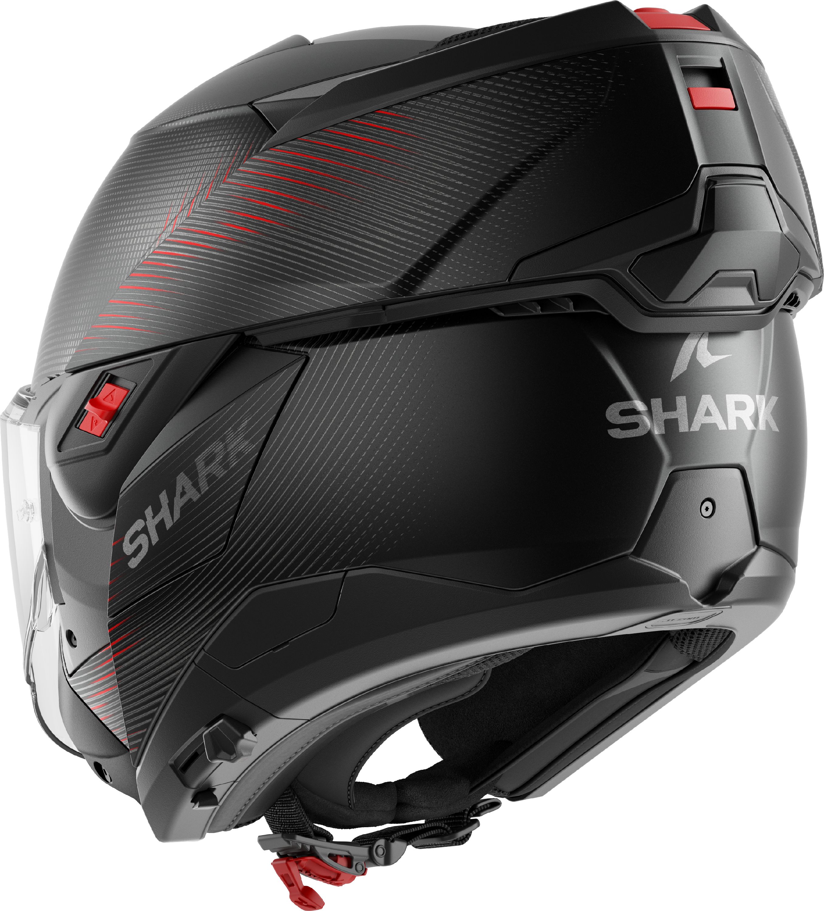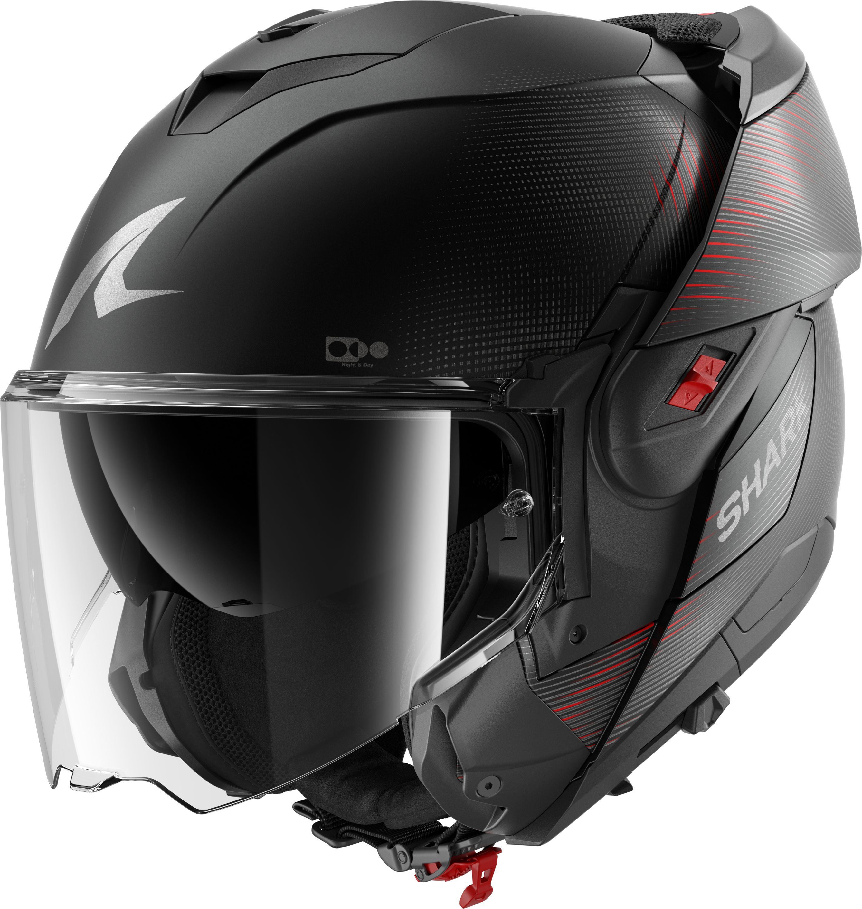 Het moet ook gezegd dat elke volgende generatie van dit type ‘flipback’-motorhelmen strakker en beter wordt. Hadden de eerste edities nog een opvallend breed kinstuk (het moet over de motorhelmschaal heen) dan is dit alweer een duidelijke evolutie. Het mechanisme om de SHARK OXO onderweg te transformeren, bevindt zich vooraan op het kinstuk. De dubbele rode knop moet ook dubbel gemanipuleerd worden: trekken én duwen. We doen het moeilijker klinken dan het is, maar het is wel een pak veiliger. In volledig opengeklapte versie kan je de SHARK OXO door middel van een rode schuiver aan het linker scharnier vastklikken.