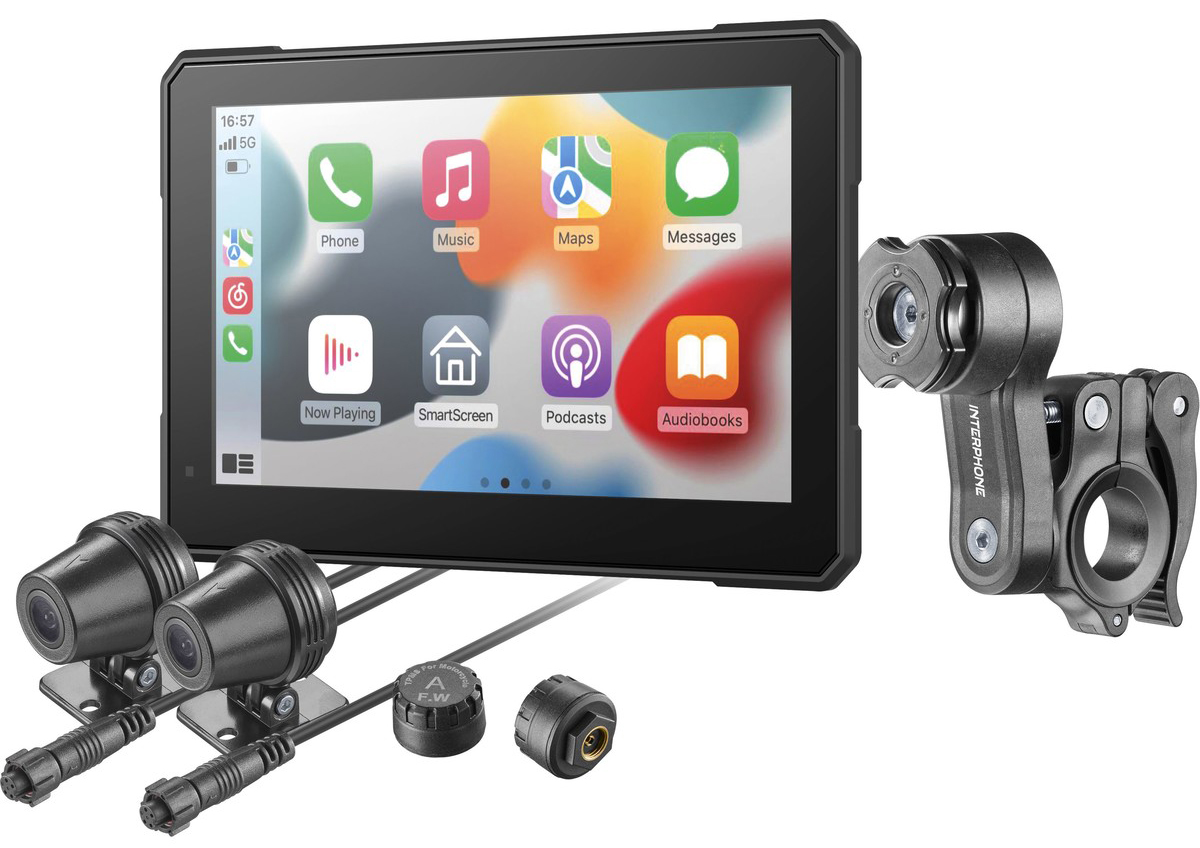 De Interphone SYNC70 is een 7 inch multimediascherm met front- en rear camera's en bandendruksensoren. Dit is de complete versie van de SYNC70, waarbij het scherm uitgebreid wordt met dashcam-functionaliteit, blindehoekdetectie en real-time bandenspanningsmonitoring.