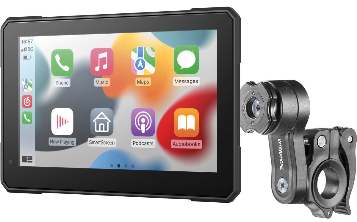 De Interphone SYNC70 Essential is een 7 inch multimediascherm voor op je motor. Dit is de grotere broer van de SYNC55, met een ruimer scherm en extra functionaliteit. Het 7 inch IPS-touchscreen brengt alle features van je smartphone naar het stuur via CarPlay of Android Auto, maar de SYNC70E gaat verder. Dit scherm kan ook dienen als digitaal dashboard dankzij een ingebouwde GPS-chip die snelheid, hoogte en kompas weergeeft.