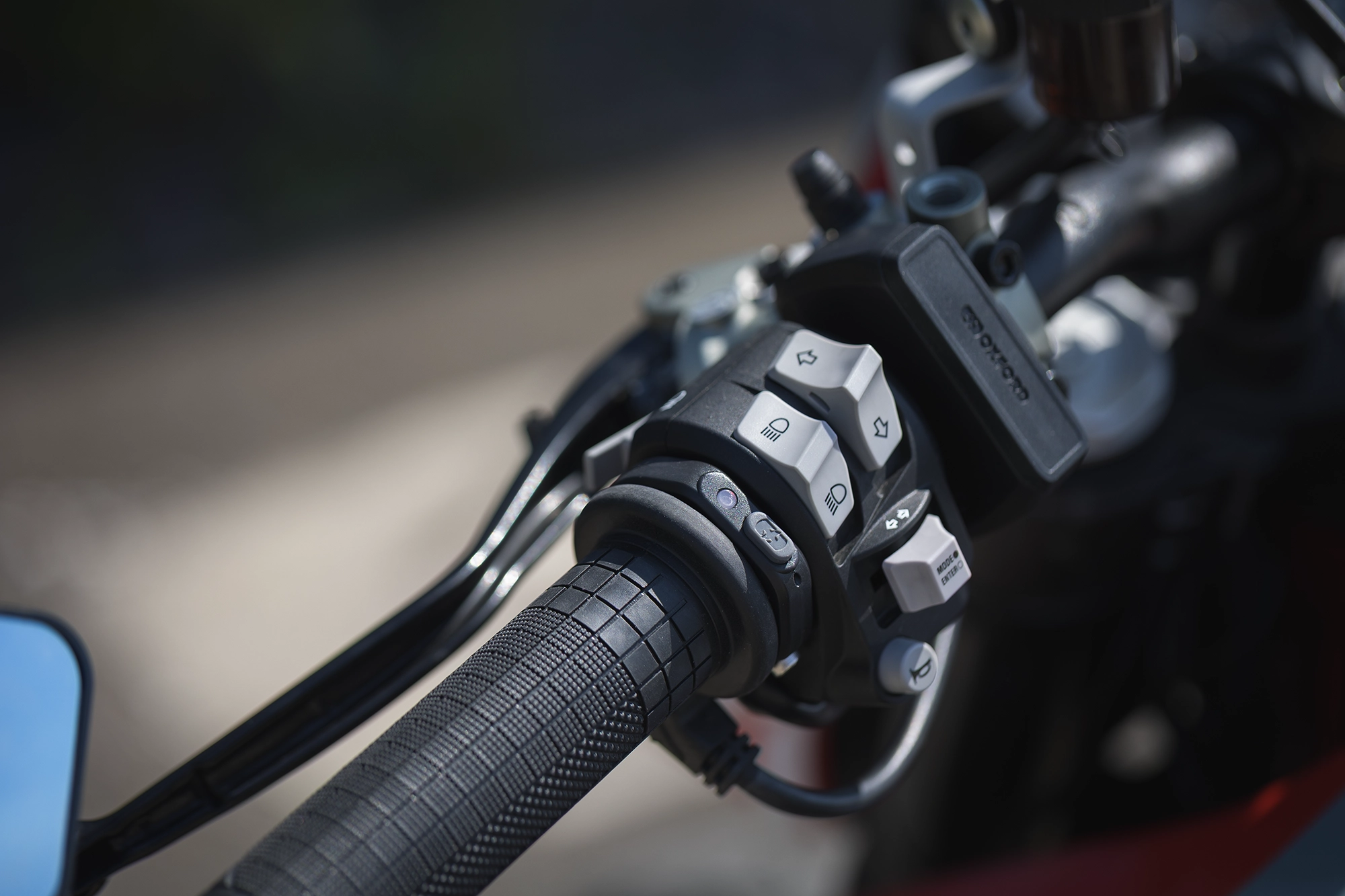 De Oxford Advanced Integrated HotGrips plaatsen de controller direct naast het handvat op je stuur, waardoor je de temperatuur aanpast zonder je hand los te laten. De controller verdwijnt visueel tussen je bestaande schakelaars en knoppen, zonder extra uitsteeksels op het stuur.